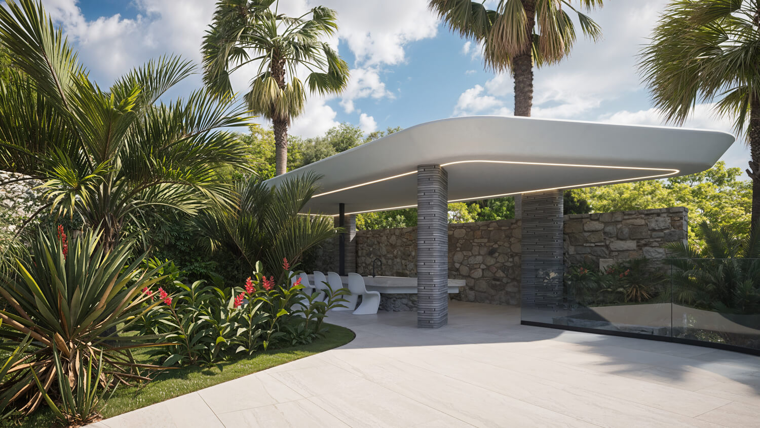 В кухне-гостиной создано светлое пространство с выходом к бассейну, террасе и панорамному виду на побережье.