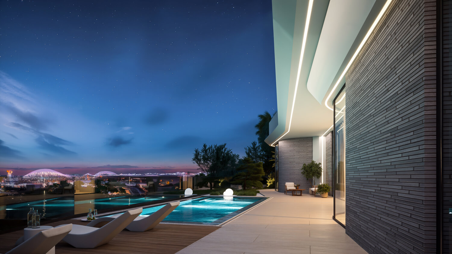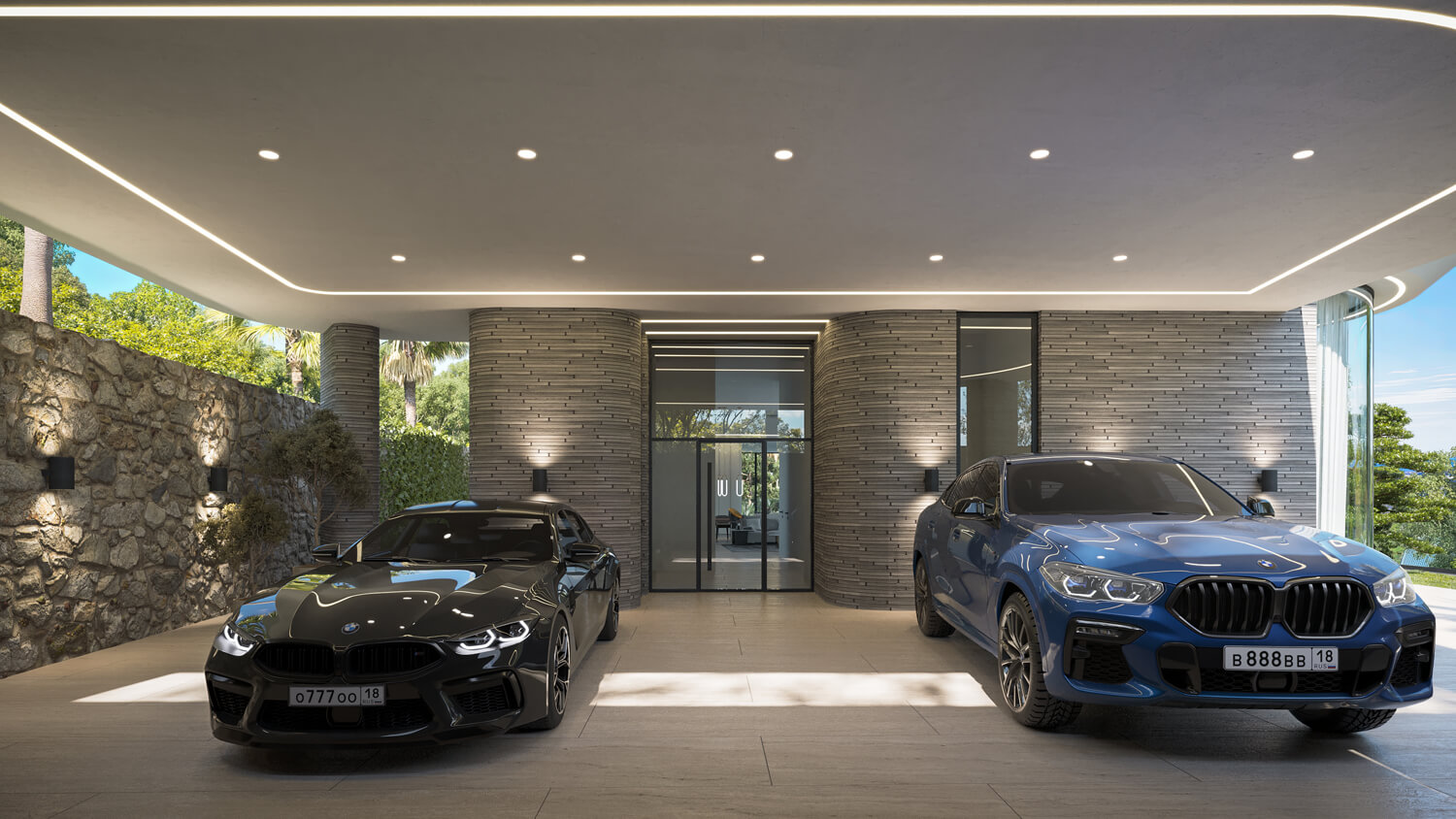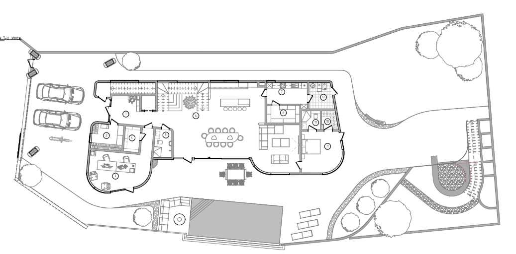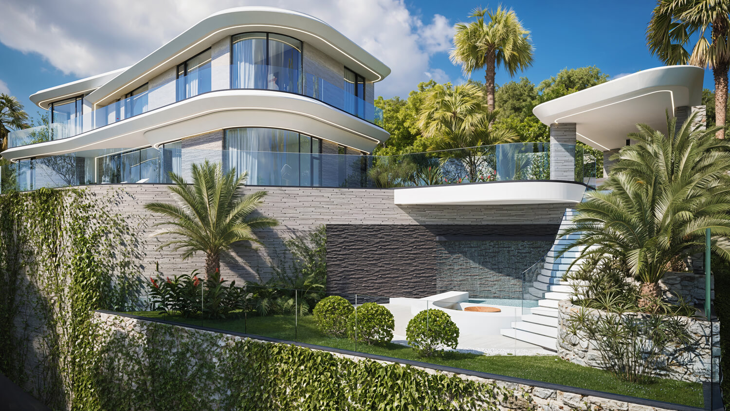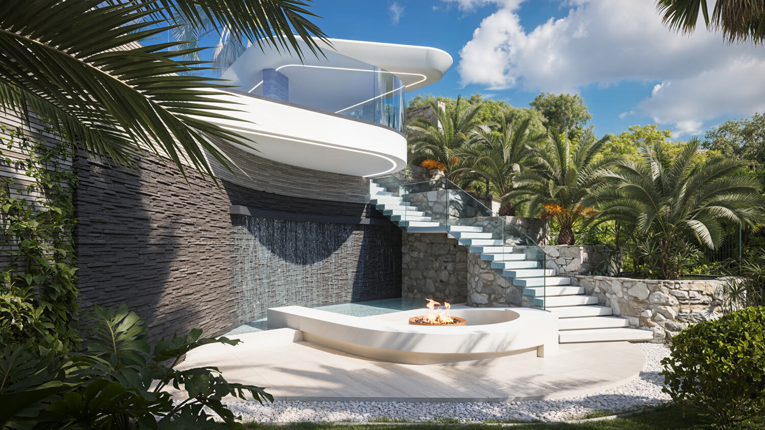 На нижнем уровне расположена приватная зона отдыха с интегрированным в архитектуру водопадом и небольшим водоёмом для умиротворения и отдыха — место, где можно полностью расслабиться, оставаясь частью природного ландшафта.
