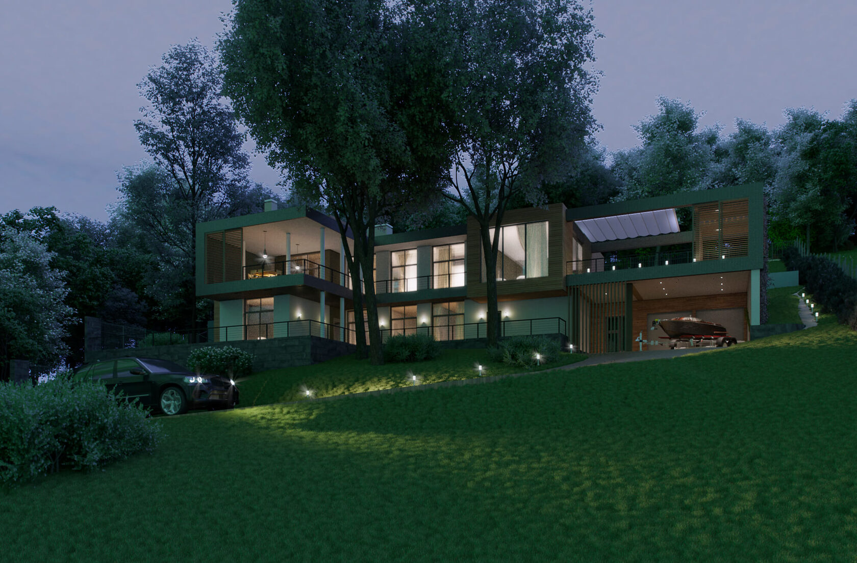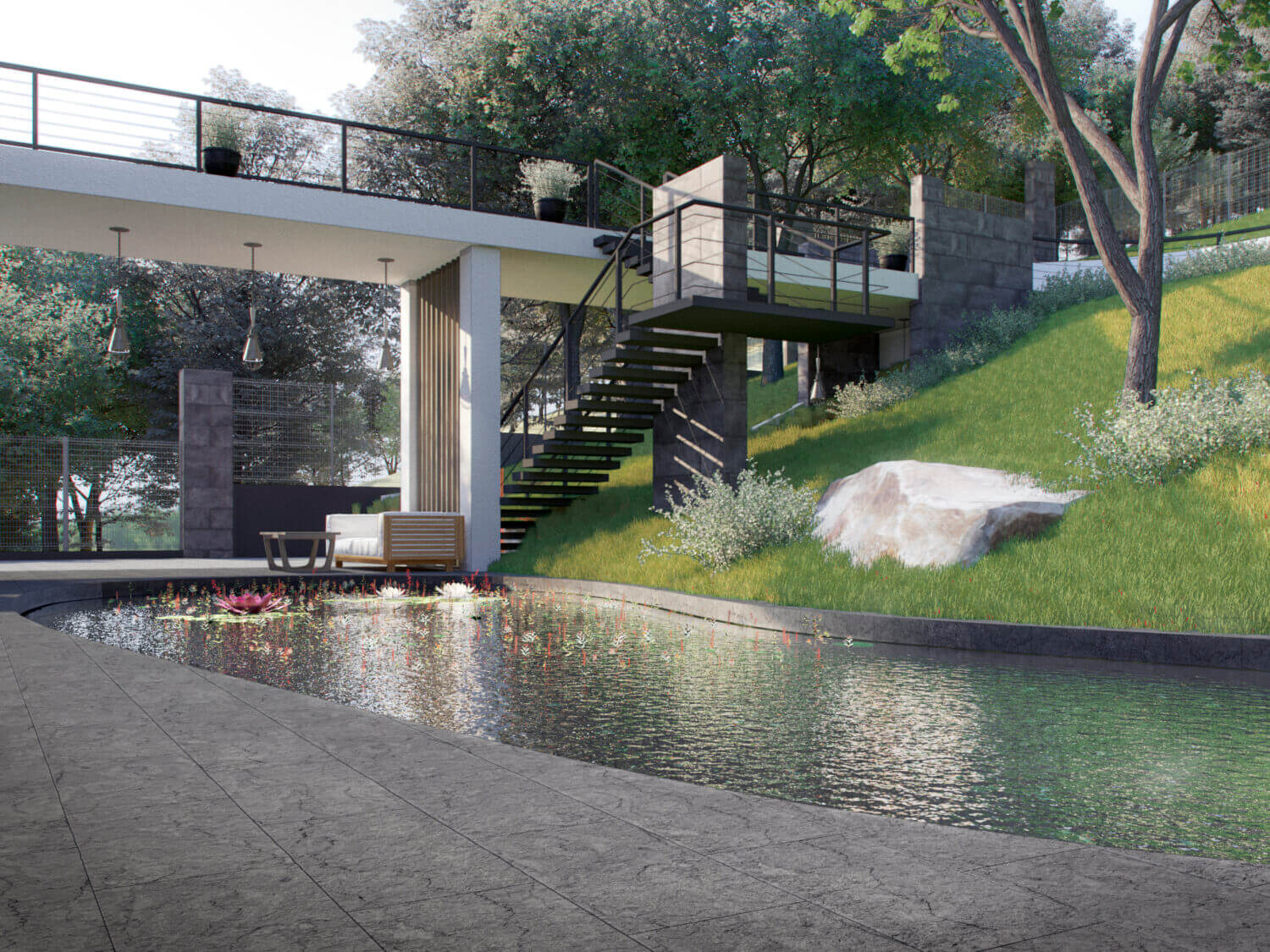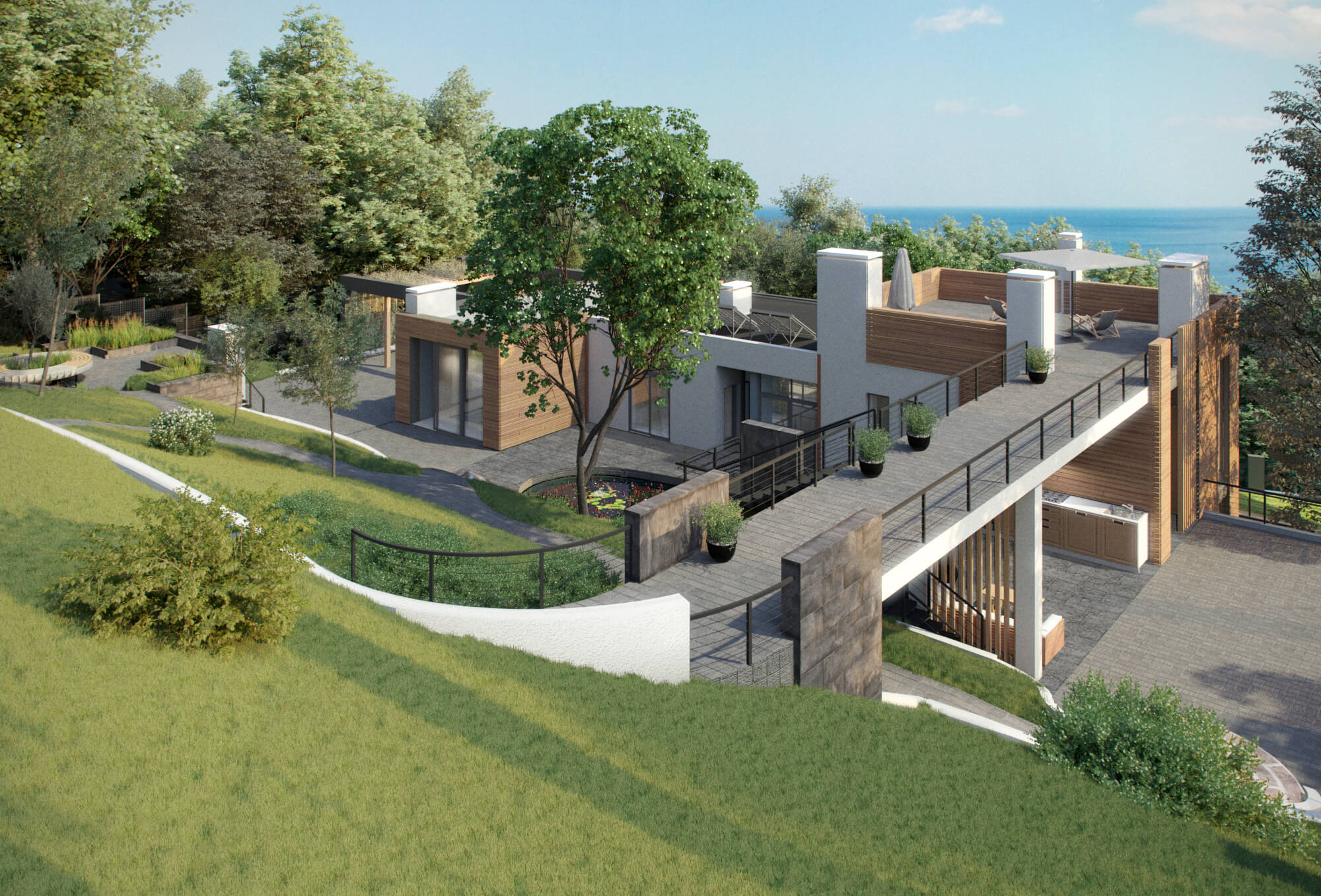 Еще одной изюминкой дома является живописный мост на эксплуатируемую кровлю. Функциональность конструкции моста дополняется уютной зоной отдыха около пруда под пролетом.
