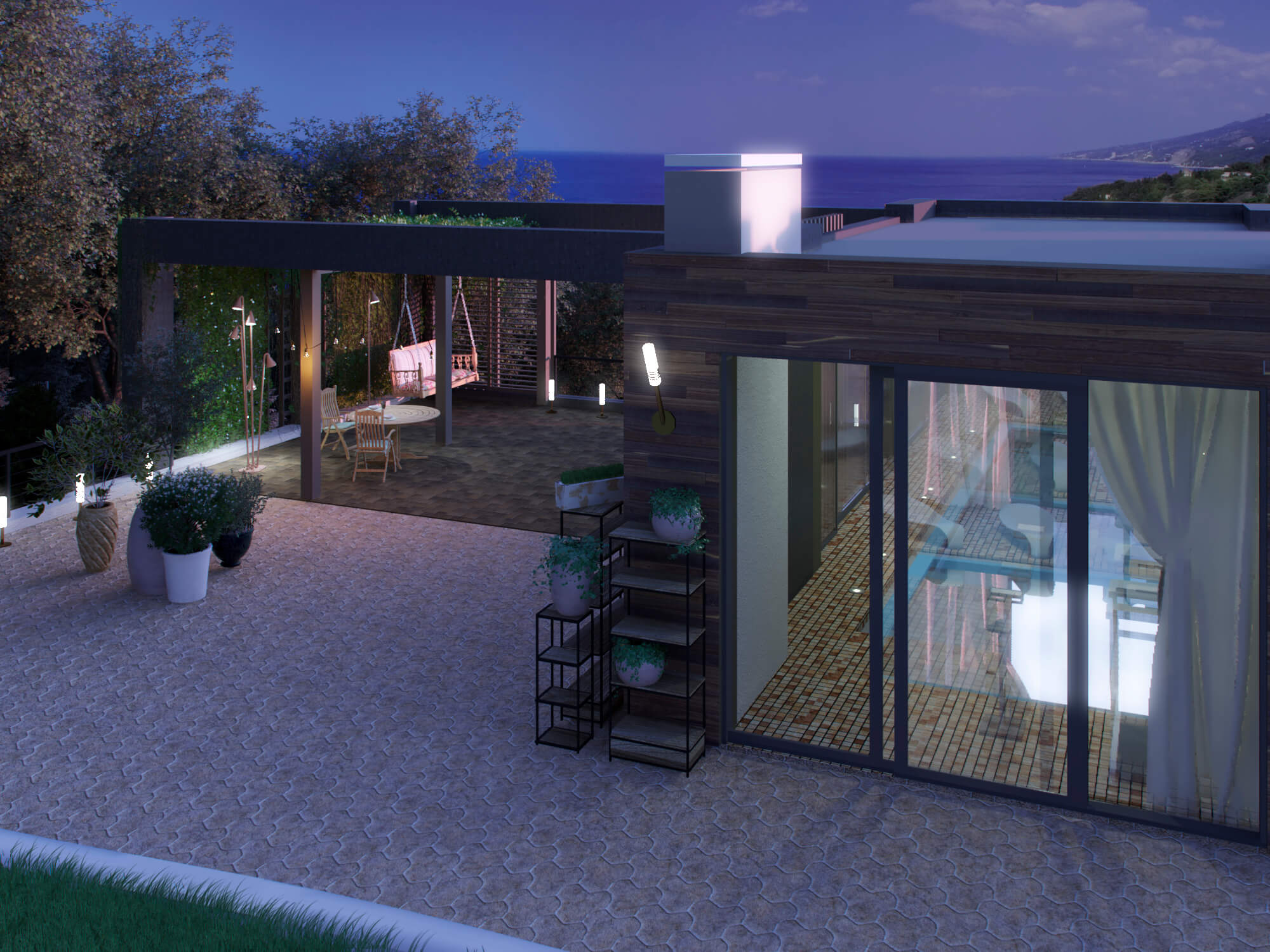 Опираясь на столь живописный вид на лес из пробковых дубов и морское побережье, мы стремились сохранить ландшафт, и максимально гармонично вписать архитектуру в природный пейзаж. Наш любимый минимализм со своими большими витражами и слайдерами как раз позволяет стереть грань между внутренним и внешним пространством и сохраняет гармонию с природой даже в интерьере.