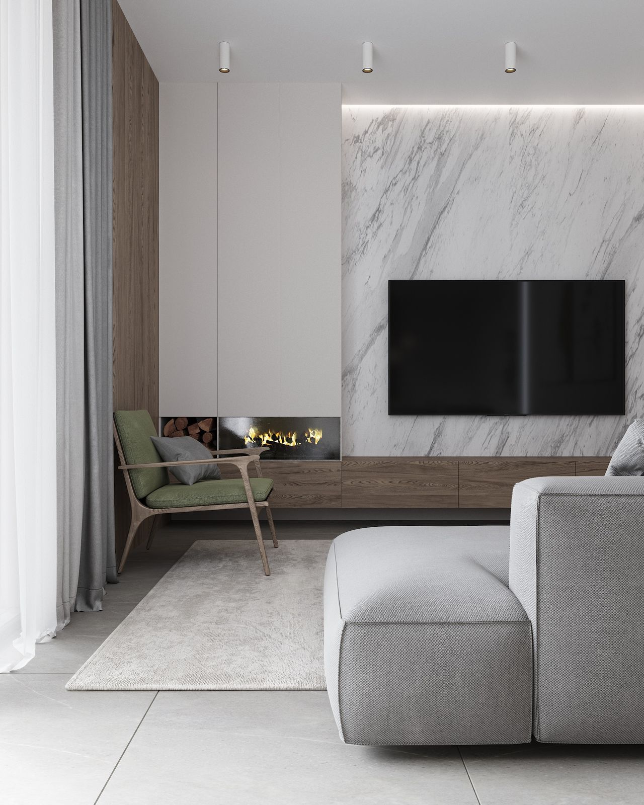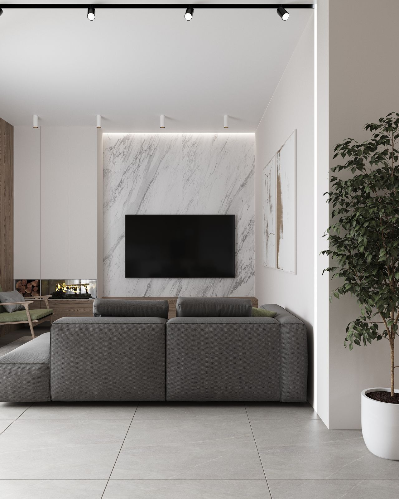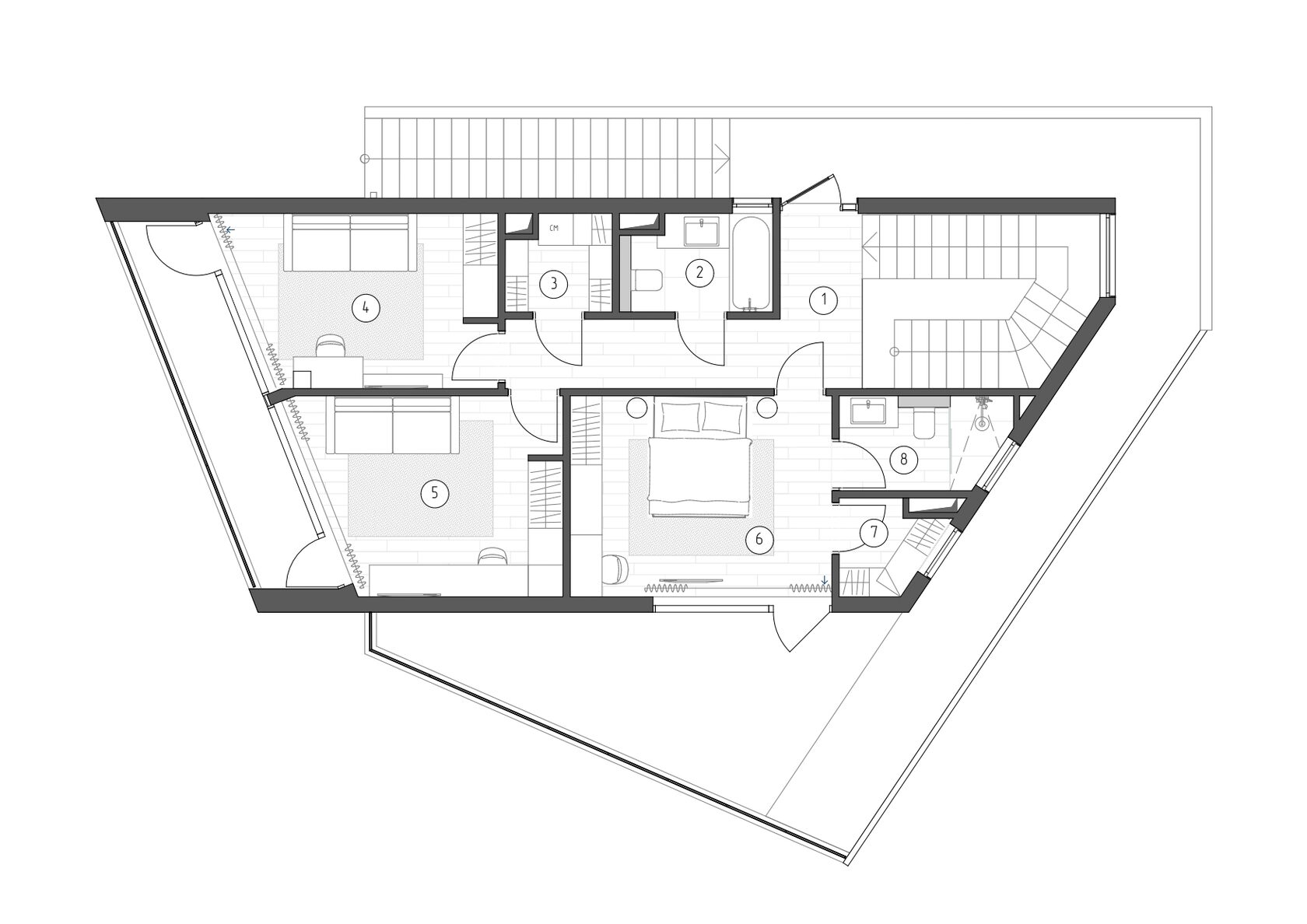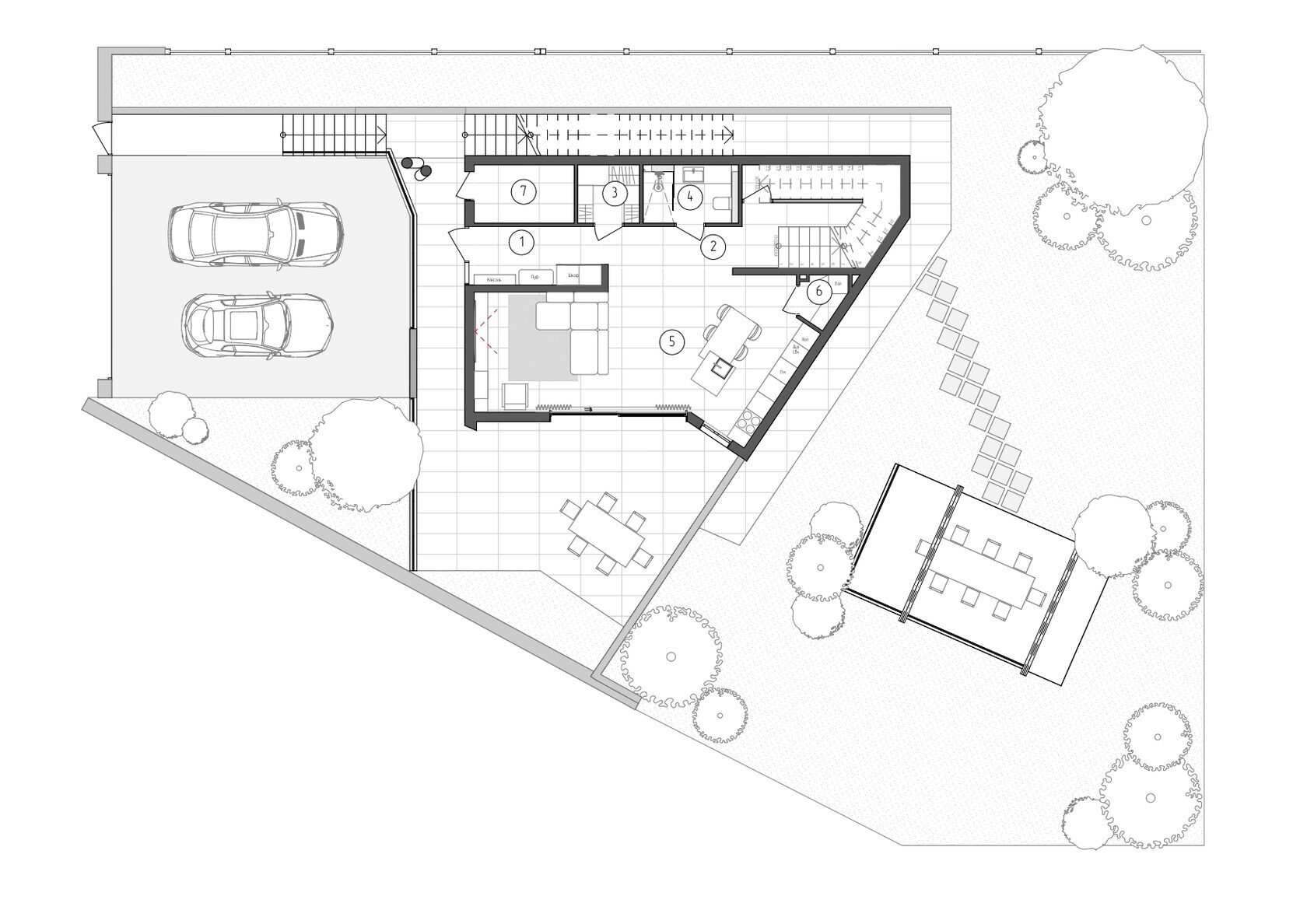 Дом построен на участке площадью в 3 сотки, с перепадом высот и треугольной формы. Нам удалось сделать достаточно большую зону для отдыха и 2 машиноместа.