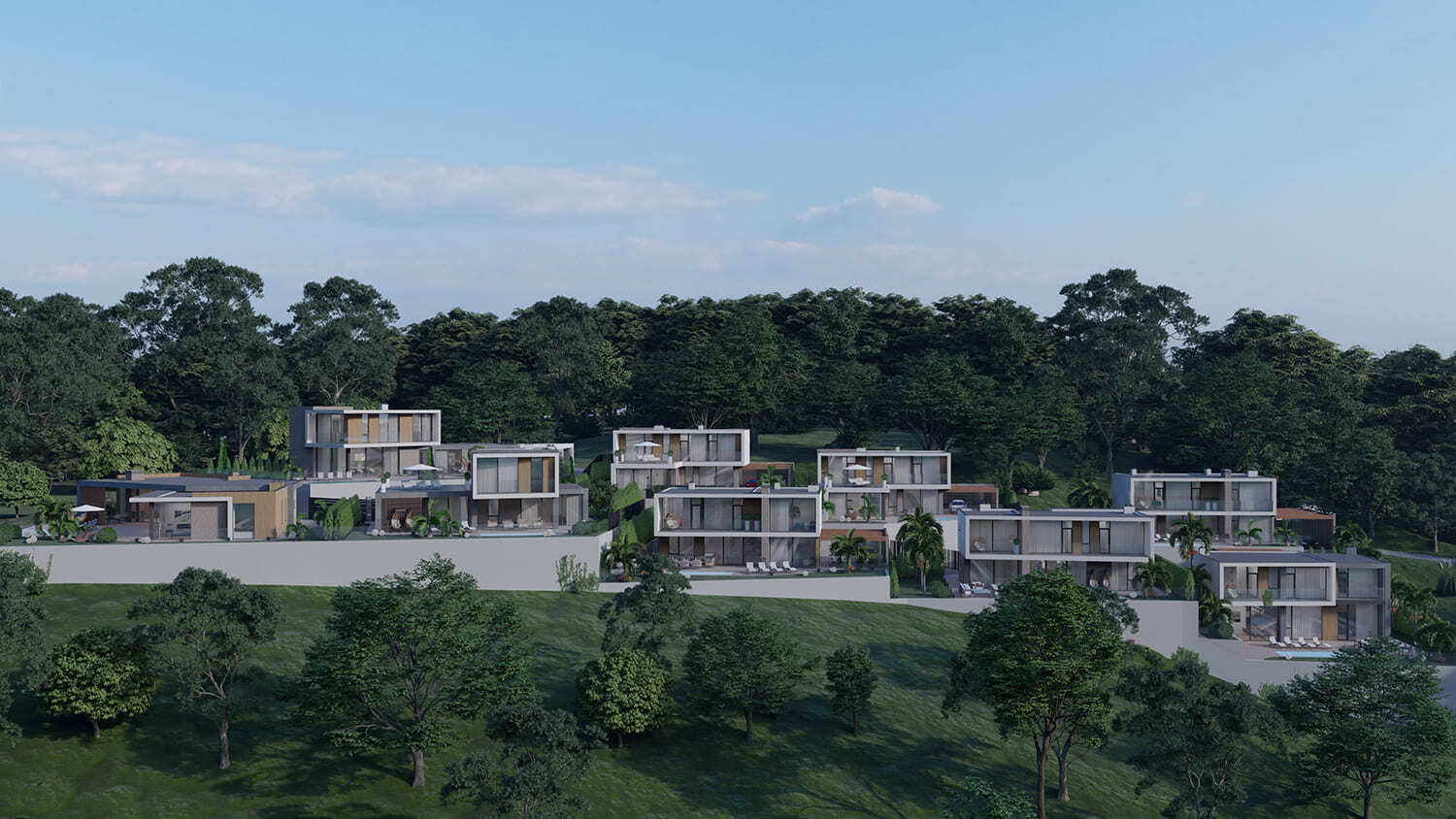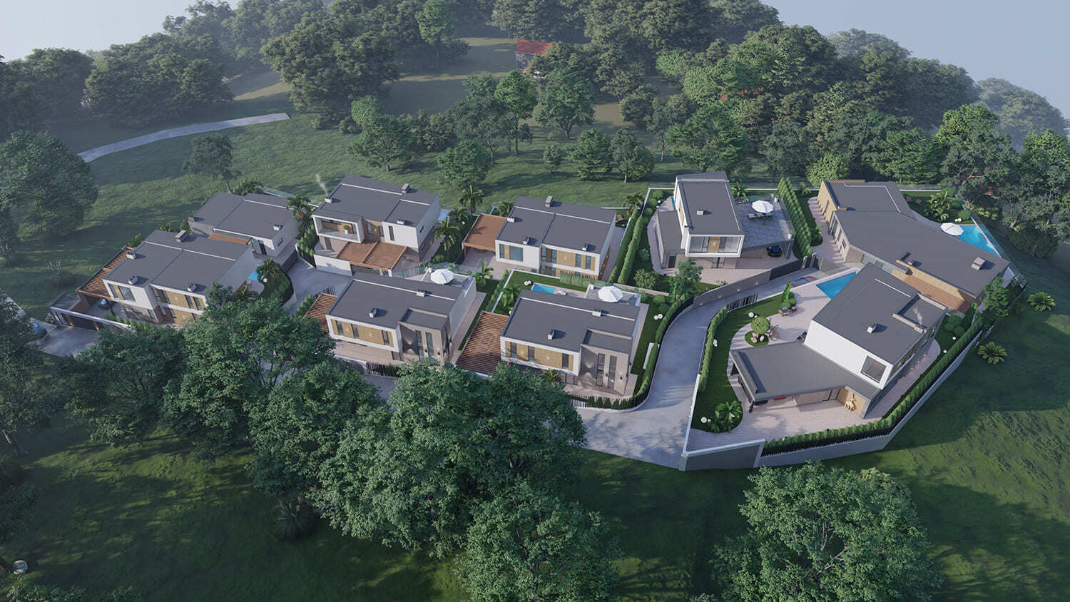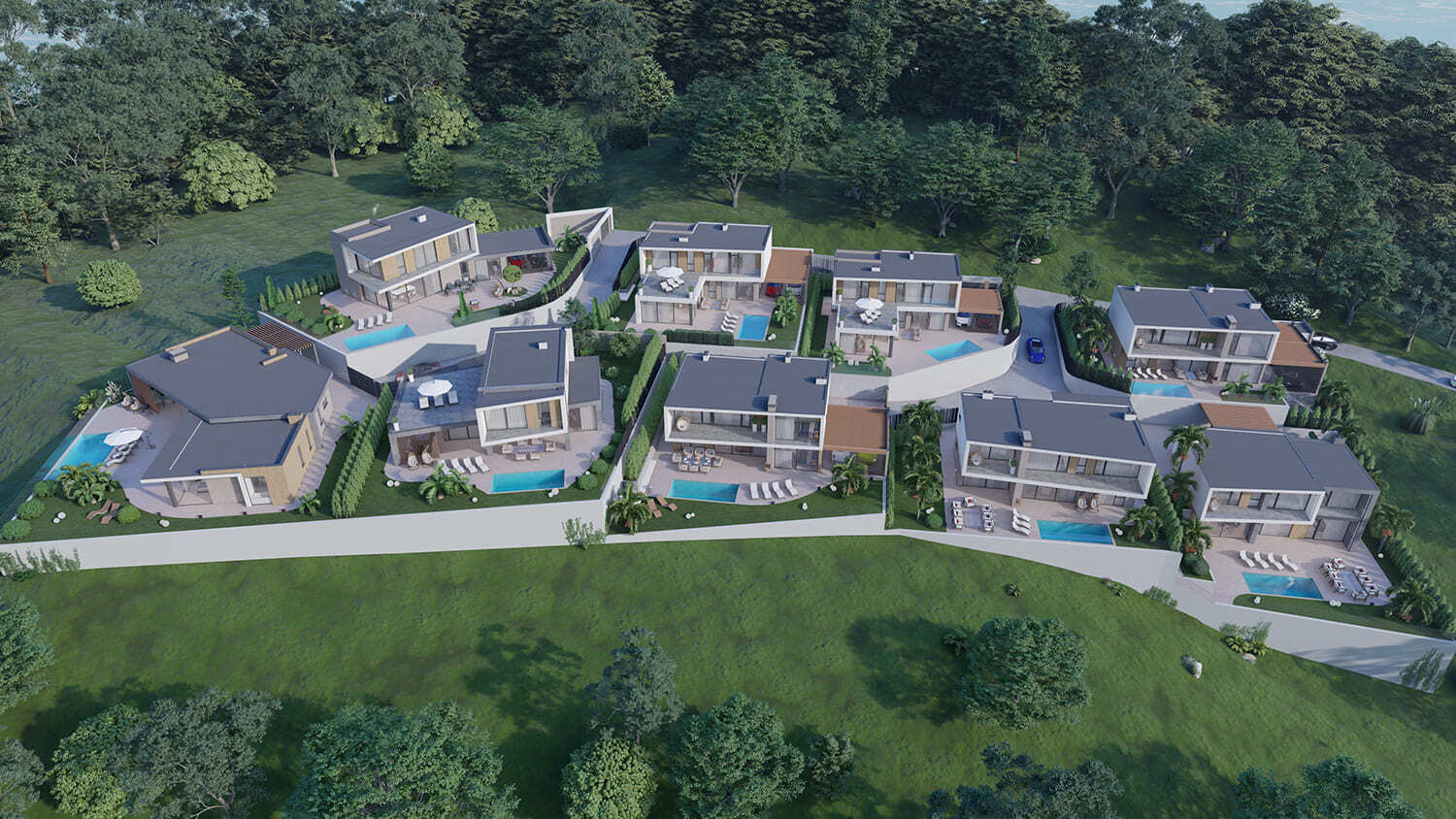 Жилой квартал частных домов. В данном проекте мы расположили все виллы таким образом, чтобы ни один дом не закрывал панорамные виды другому. Ведь одним из ключевых факторов для покупки подобных домов является «Фактор-соседа», то есть людям комфортнее проживать в домах, которые соответствуют друг другу по качеству, виду и стоимости.