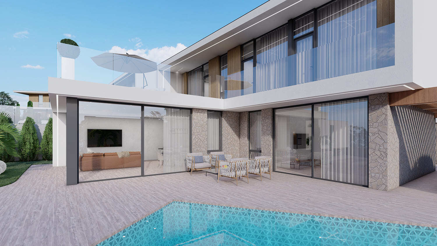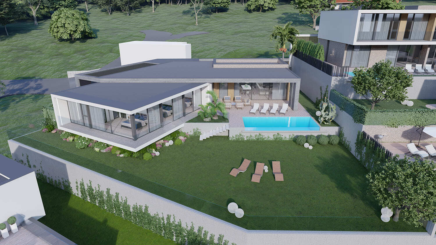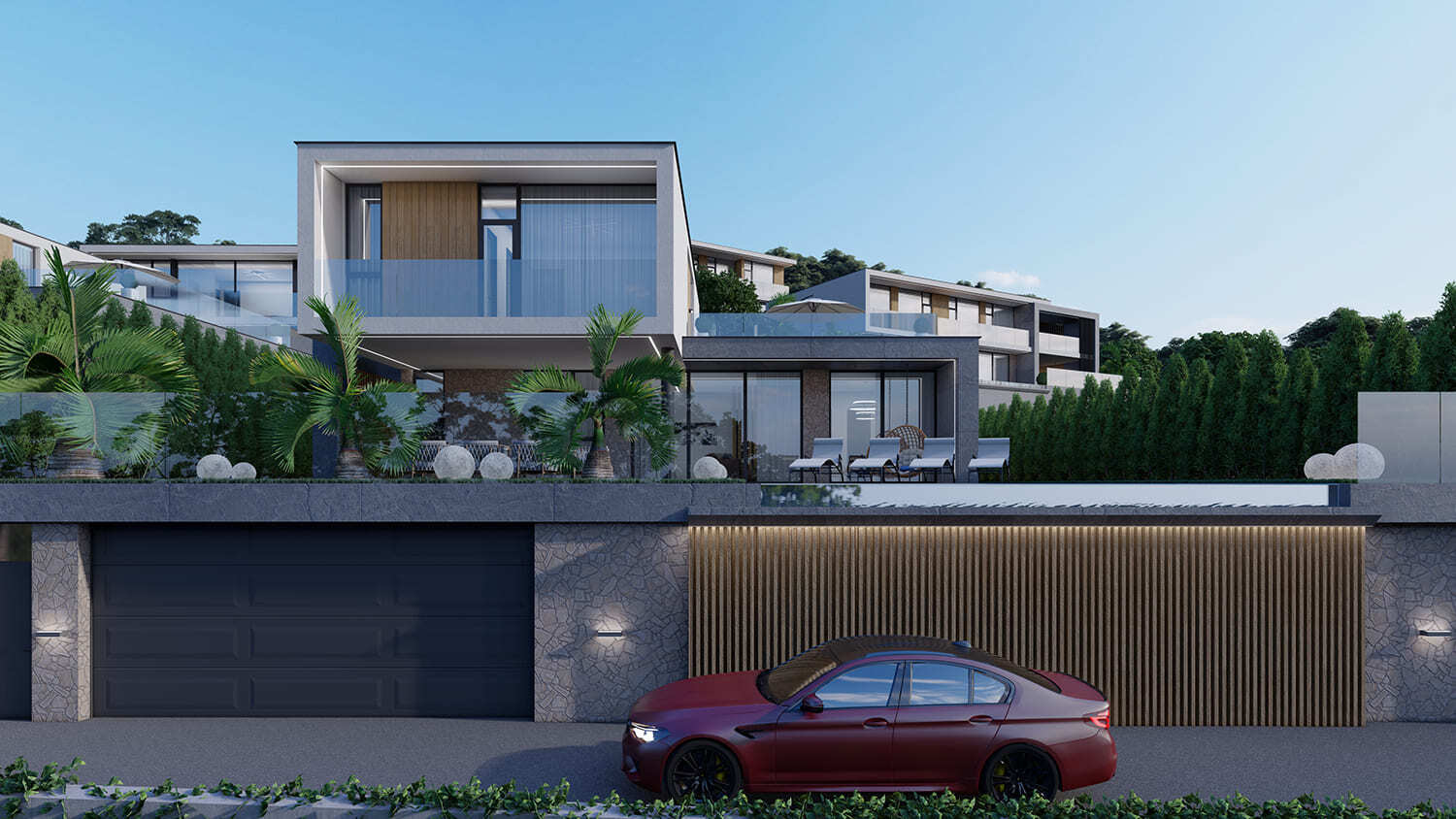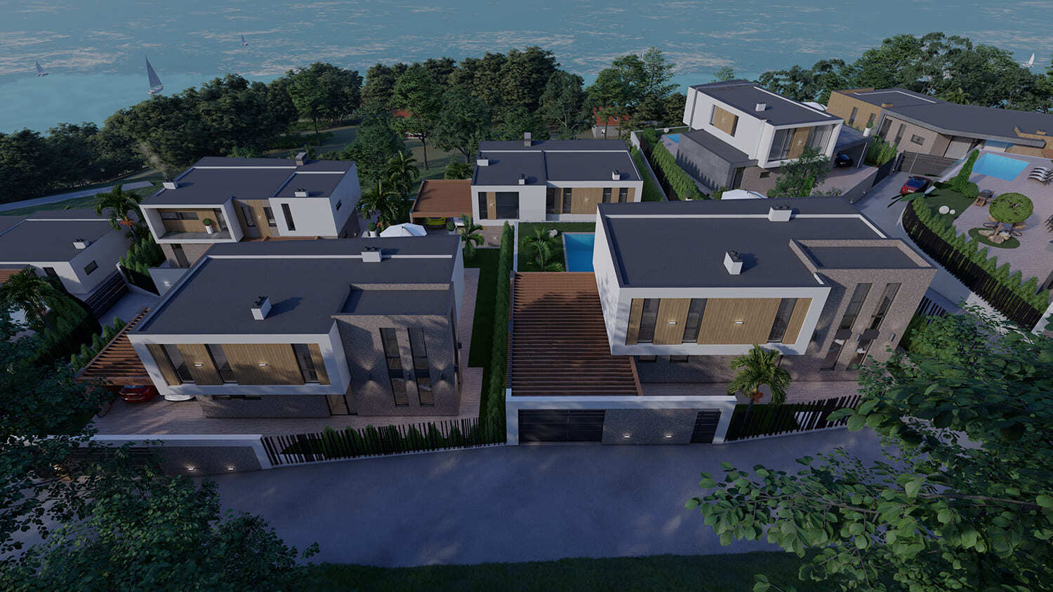 Жилой квартал частных домов. В данном проекте мы расположили все виллы таким образом, чтобы ни один дом не закрывал панорамные виды другому. Ведь одним из ключевых факторов для покупки подобных домов является «Фактор-соседа», то есть людям комфортнее проживать в домах, которые соответствуют друг другу по качеству, виду и стоимости.