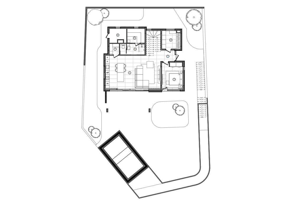- на верхних двух расположено здание с благоустроенной площадкой перед домом и бассейном;