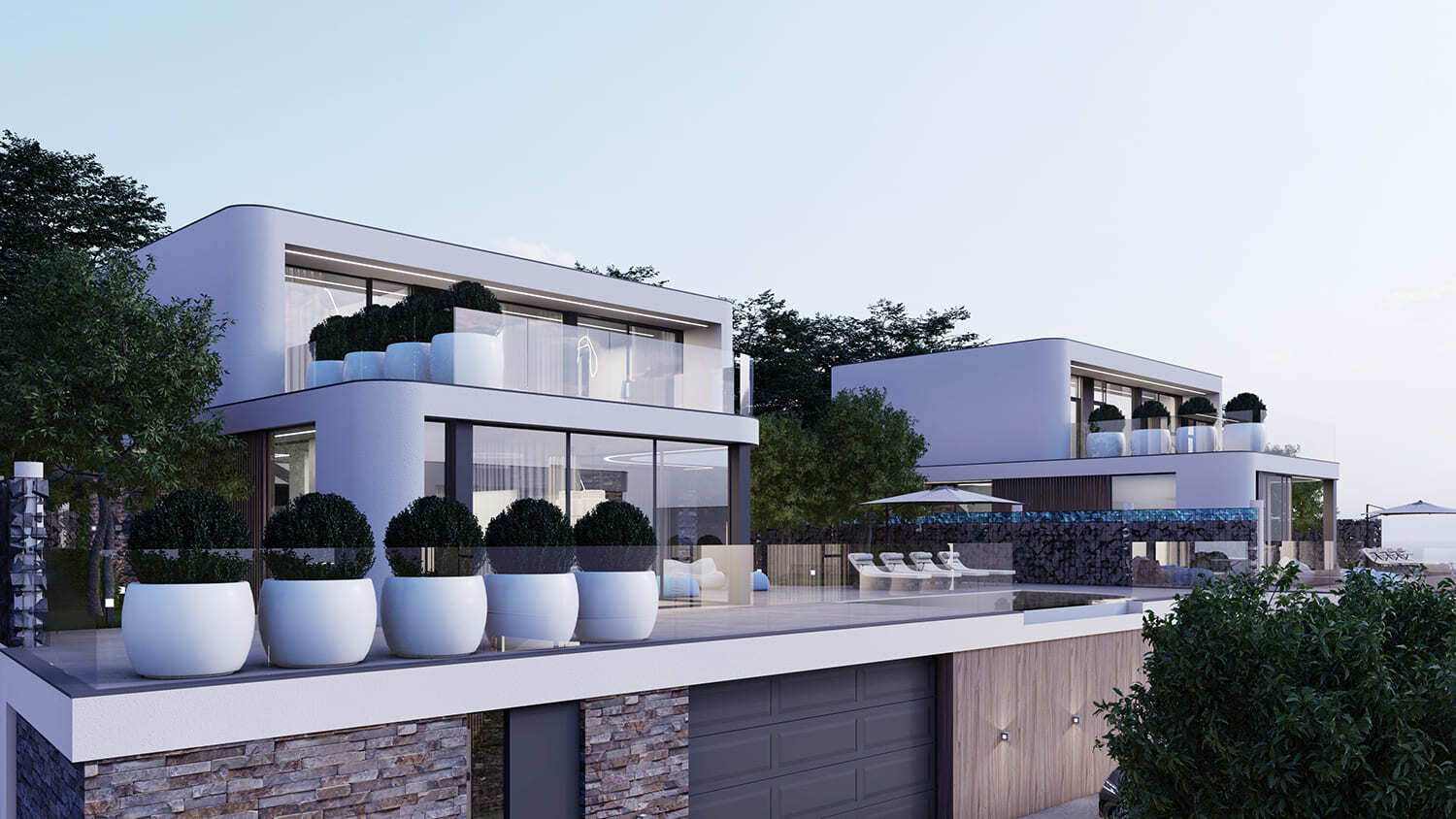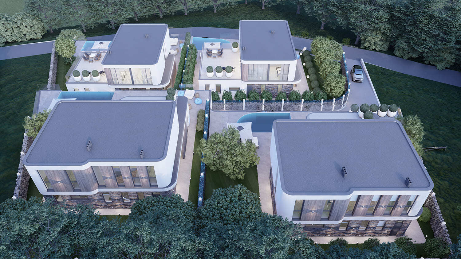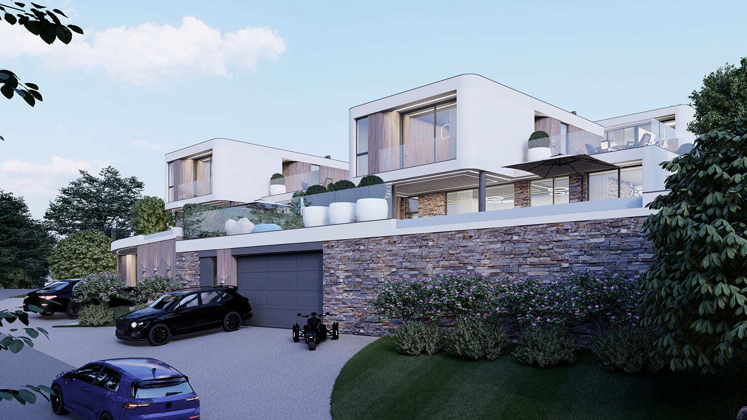 Все дома расположены на участке 6 соток, что позволяет собственникам наслаждаться простором и тишиной. Мы использовали террасирование участков, и эксплуатируемая кровля гаража позволила нам создать прекрасную территорию с зоной патио и бассейна. Это позволит нашим жильцам наслаждаться красотой окружающей природы и комфортом пребывания на своих участках в любую погоду.