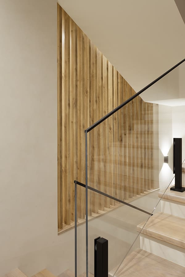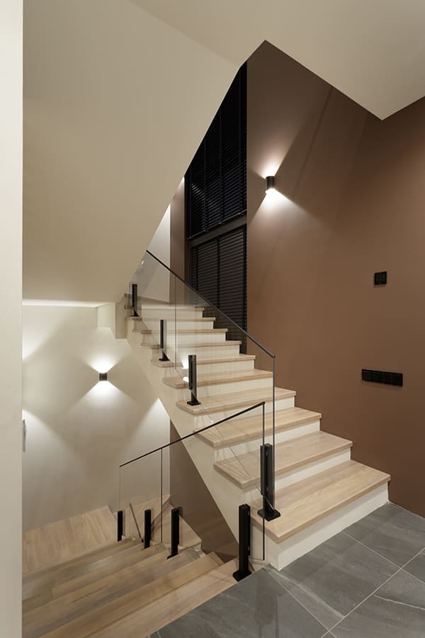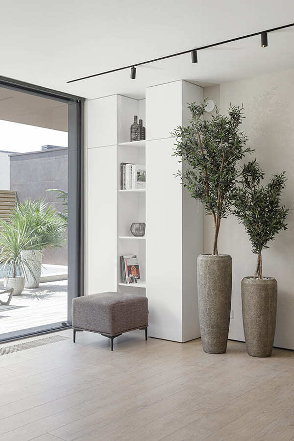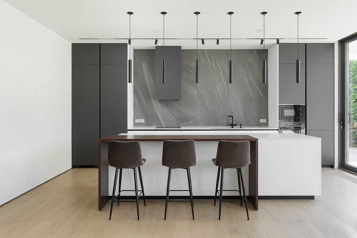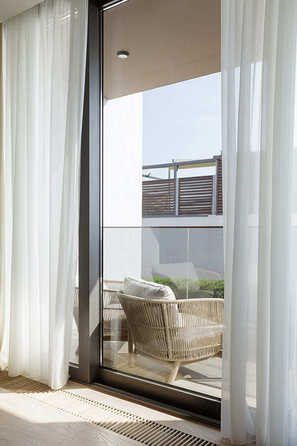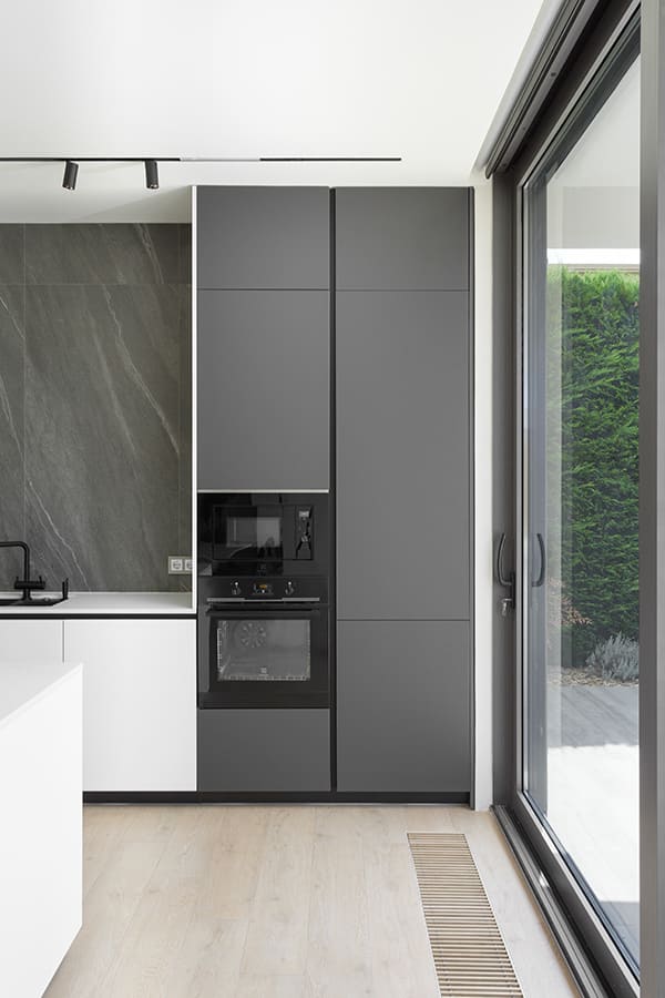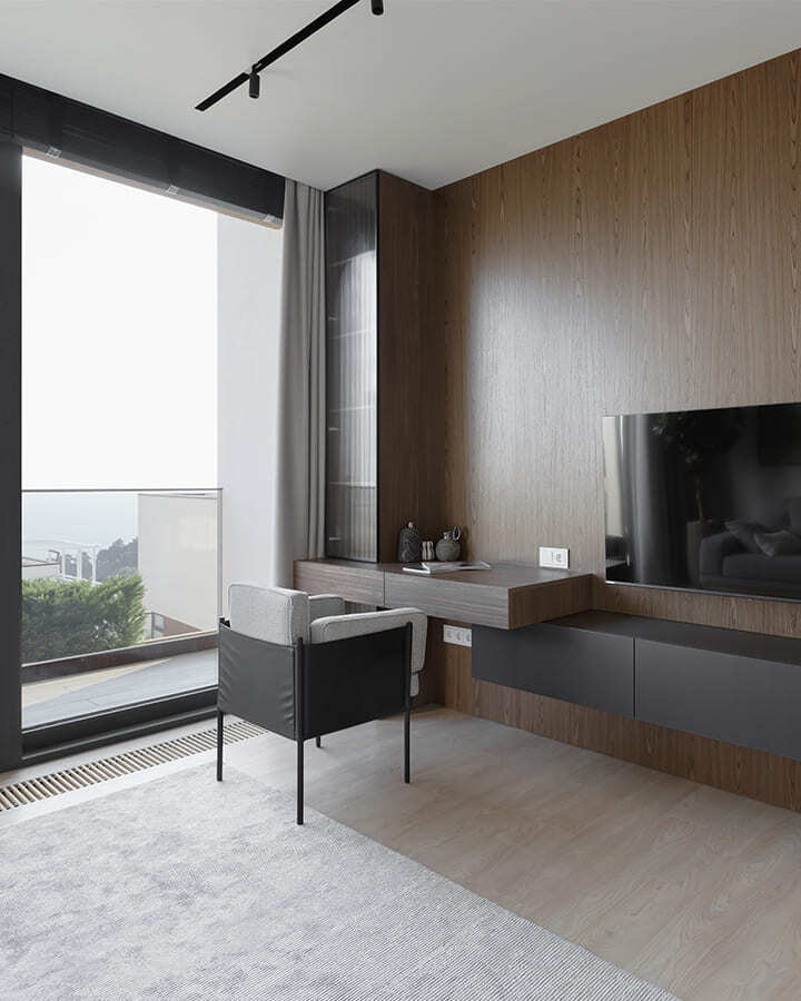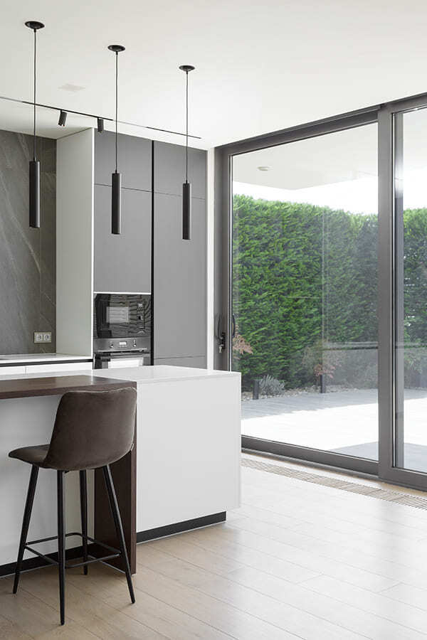 Во всех комнатах установлены панорамные окна, поэтому дом максимально наполнен светом и воздухом. В гостиной-кухне установили витражи-слайдеры, которые в летний период можно открыть и создать единое пространство с улицей. Для большего эффекта стирания границ мы отделали террасу и внутренний интерьер кухни-гостиной одним и тем же материалом — керамогранитом с имитацией древесной текстуры.