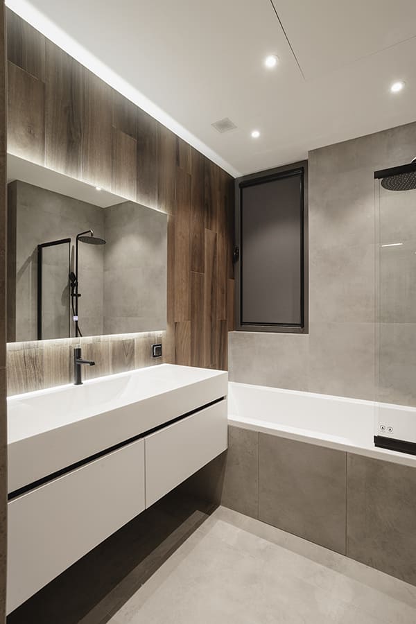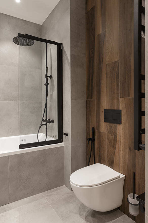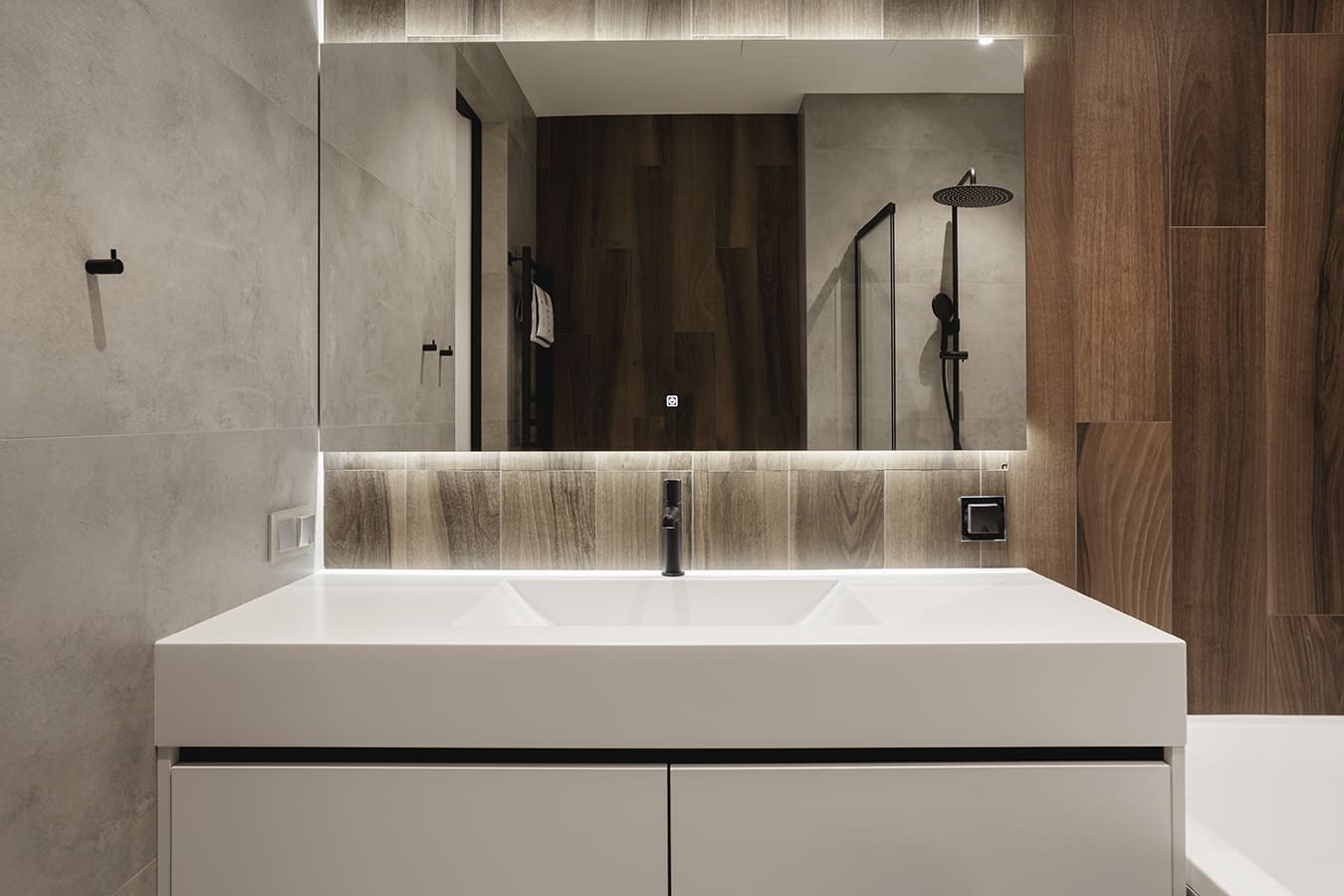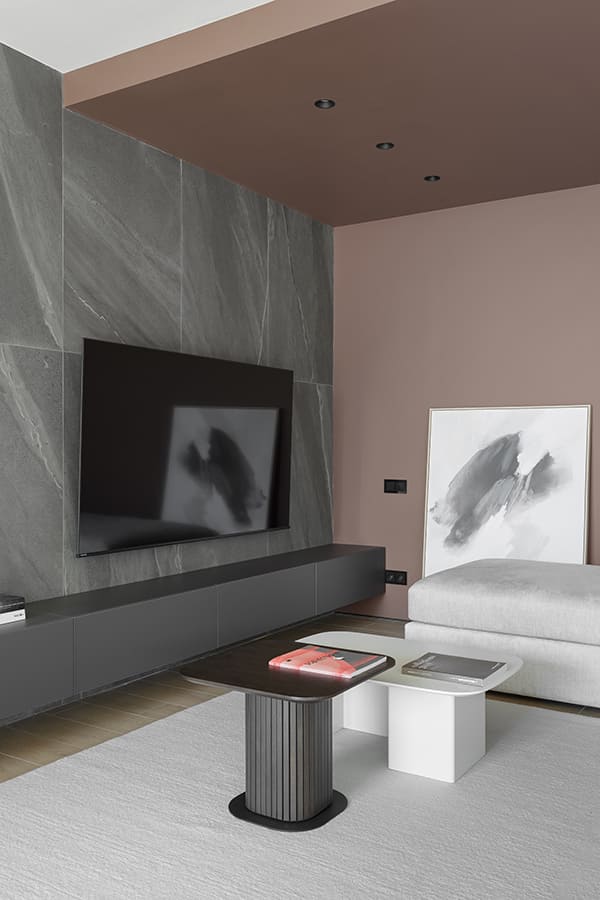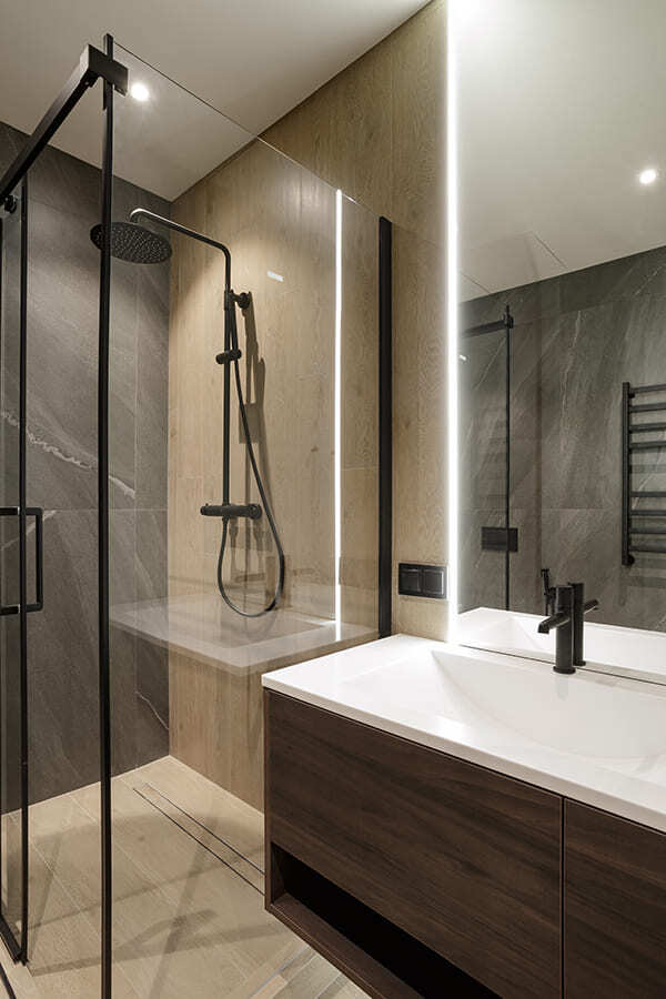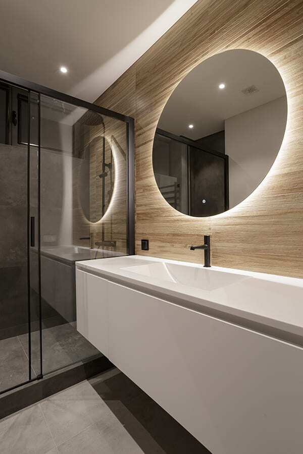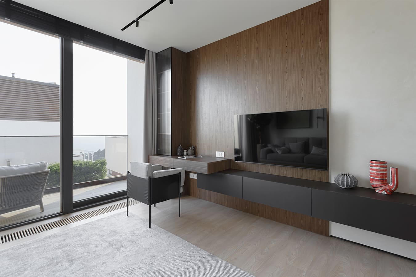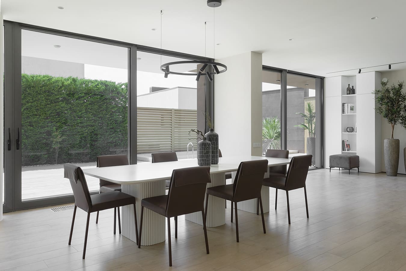 Во всех комнатах установлены панорамные окна, поэтому дом максимально наполнен светом и воздухом. В гостиной-кухне установили витражи-слайдеры, которые в летний период можно открыть и создать единое пространство с улицей. Для большего эффекта стирания границ мы отделали террасу и внутренний интерьер кухни-гостиной одним и тем же материалом — керамогранитом с имитацией древесной текстуры.