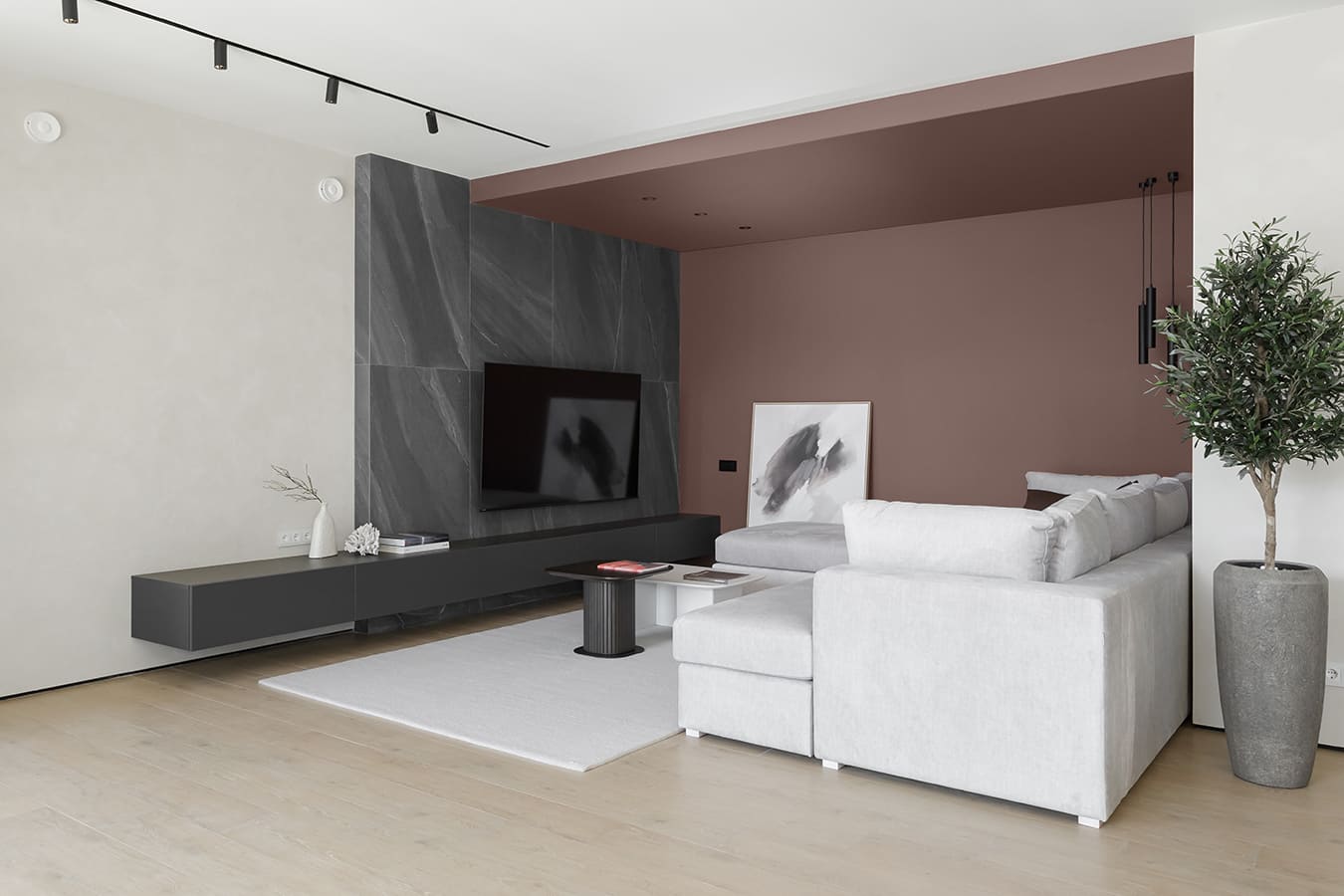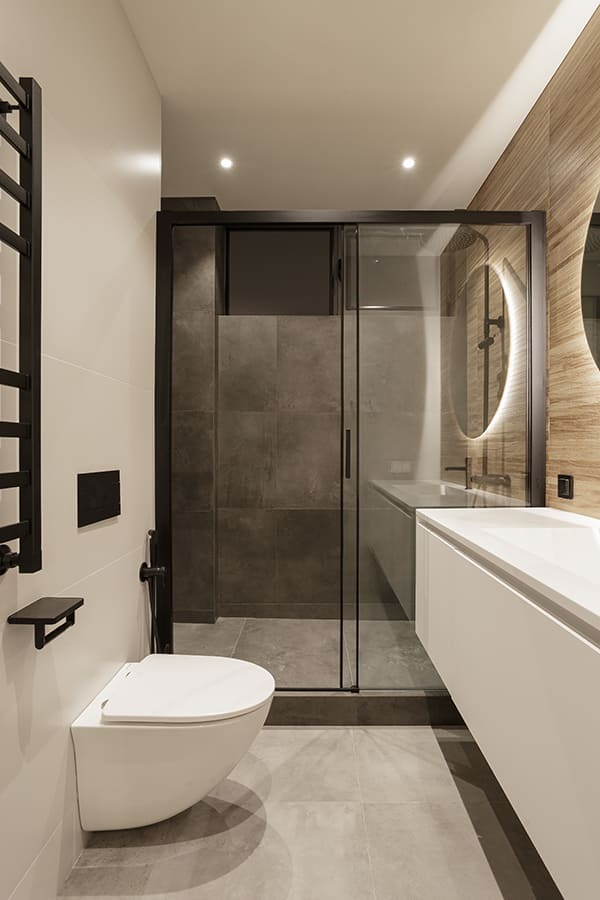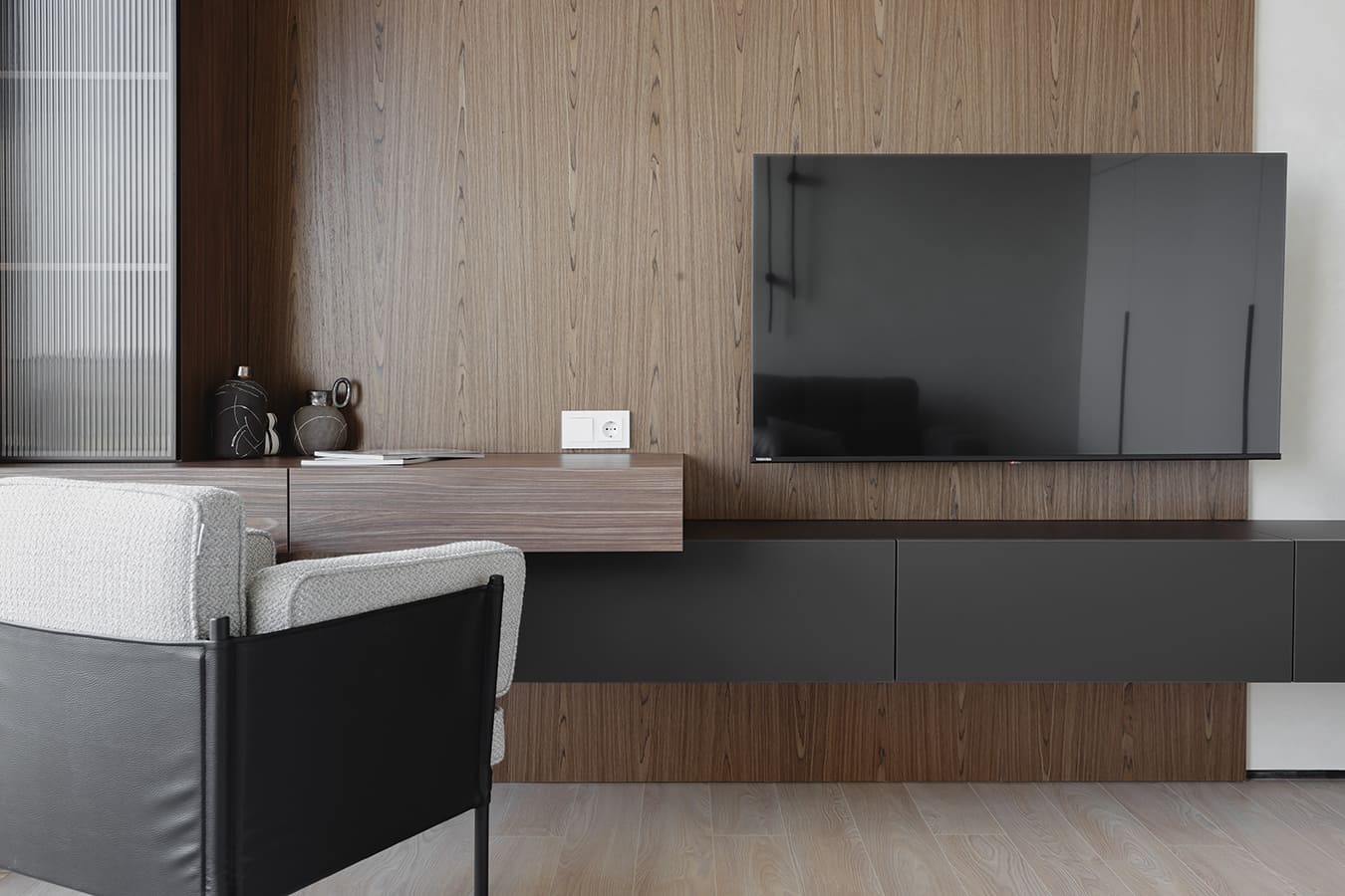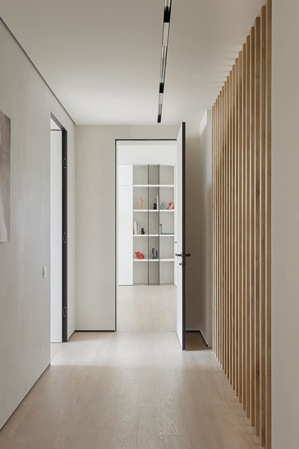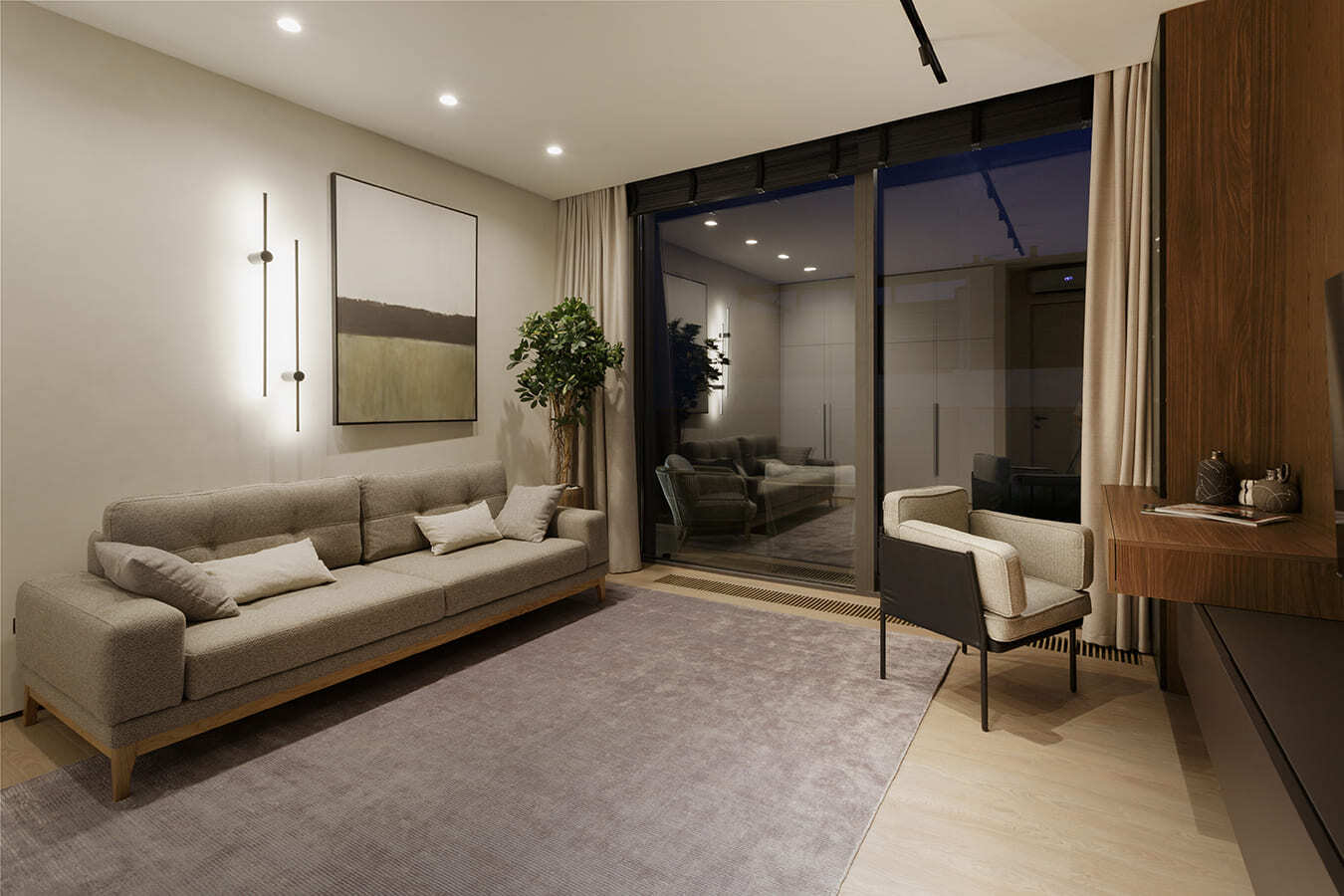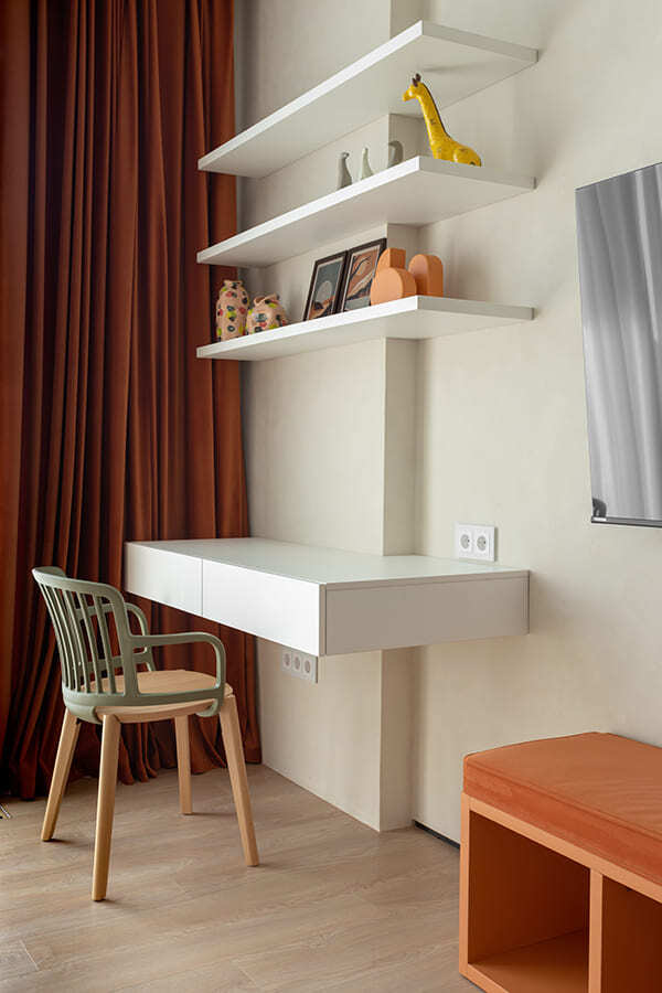 Во всех комнатах установлены панорамные окна, поэтому дом максимально наполнен светом и воздухом. В гостиной-кухне установили витражи-слайдеры, которые в летний период можно открыть и создать единое пространство с улицей. Для большего эффекта стирания границ мы отделали террасу и внутренний интерьер кухни-гостиной одним и тем же материалом — керамогранитом с имитацией древесной текстуры.