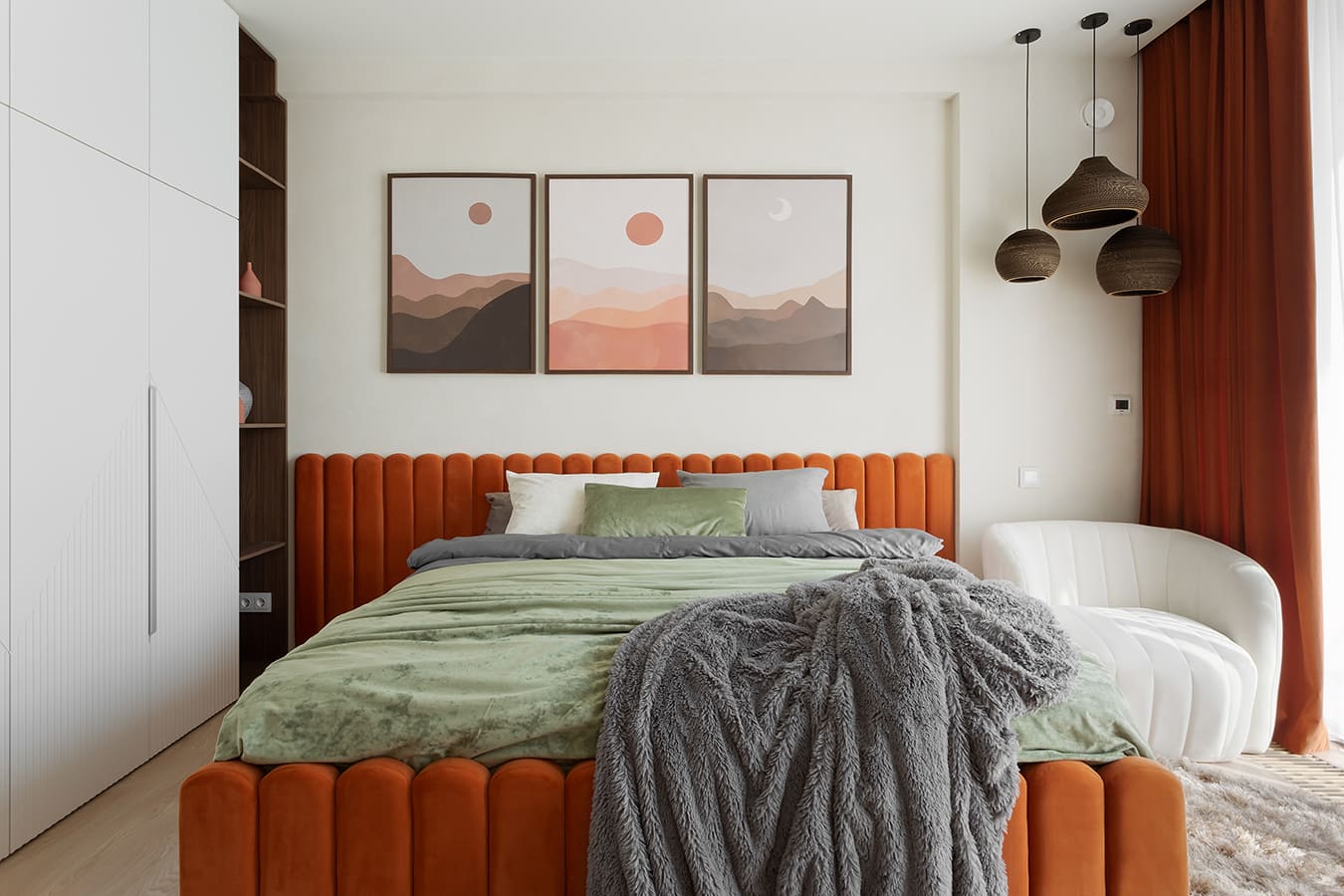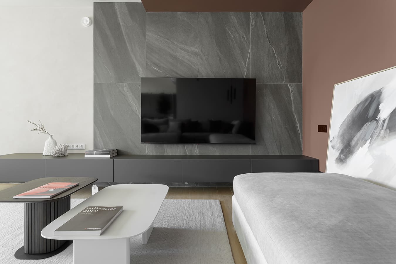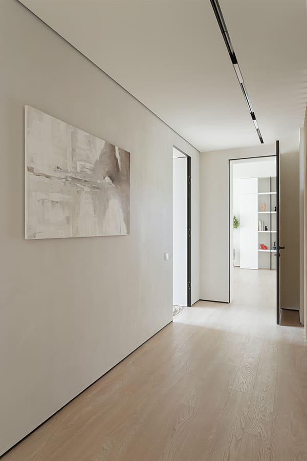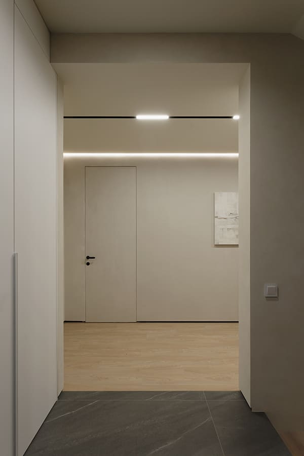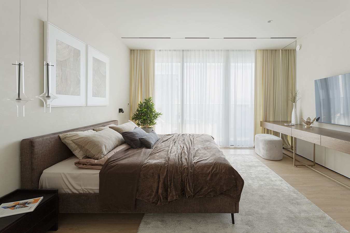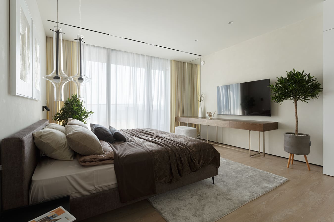 Во всех комнатах установлены панорамные окна, поэтому дом максимально наполнен светом и воздухом. В гостиной-кухне установили витражи-слайдеры, которые в летний период можно открыть и создать единое пространство с улицей. Для большего эффекта стирания границ мы отделали террасу и внутренний интерьер кухни-гостиной одним и тем же материалом — керамогранитом с имитацией древесной текстуры.