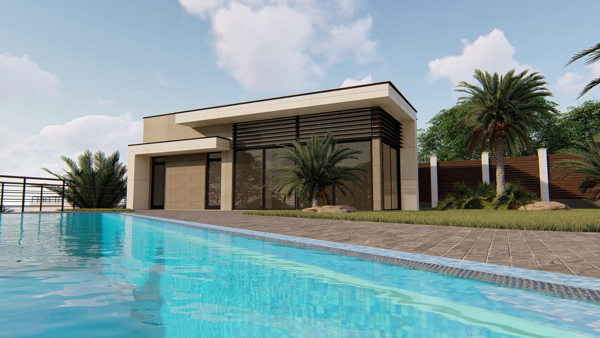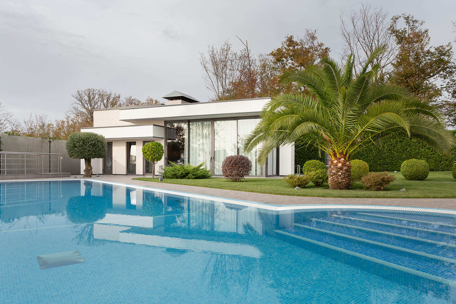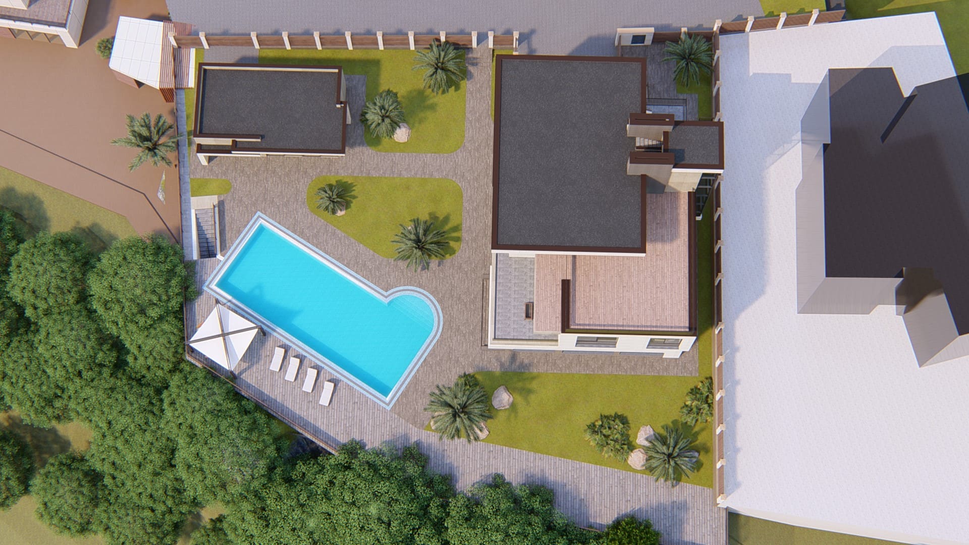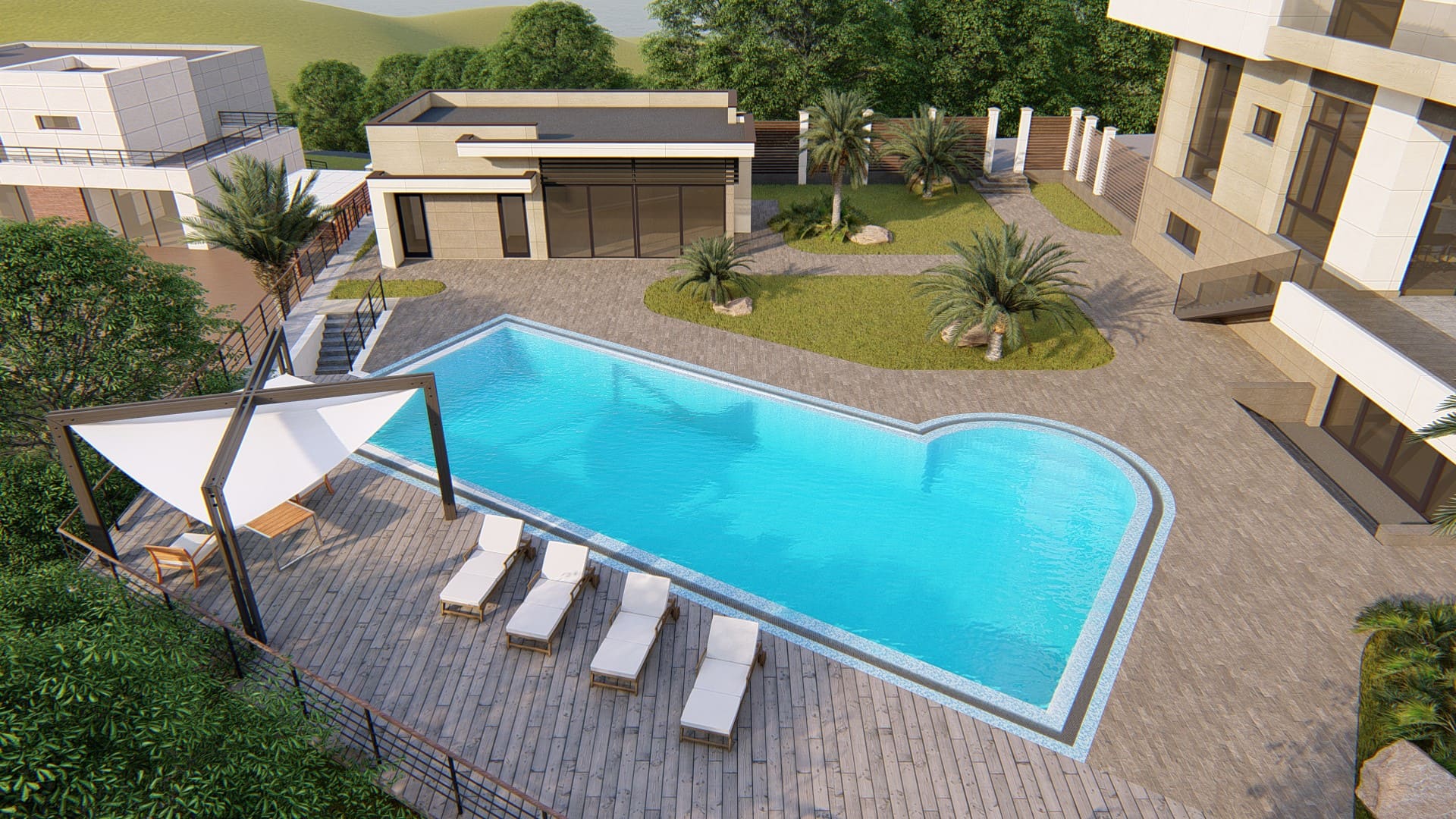 На благоустроенном участке помимо дома и бассейна построена беседка с зоной барбекю, комнатой отдыха, санузлом, котельной и дизель-генераторной установкой.