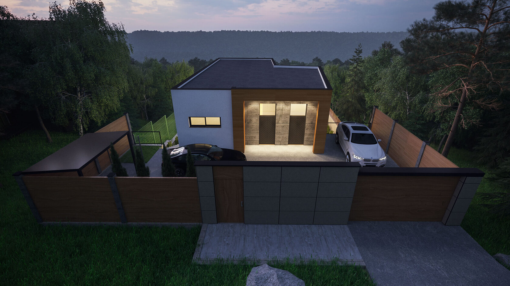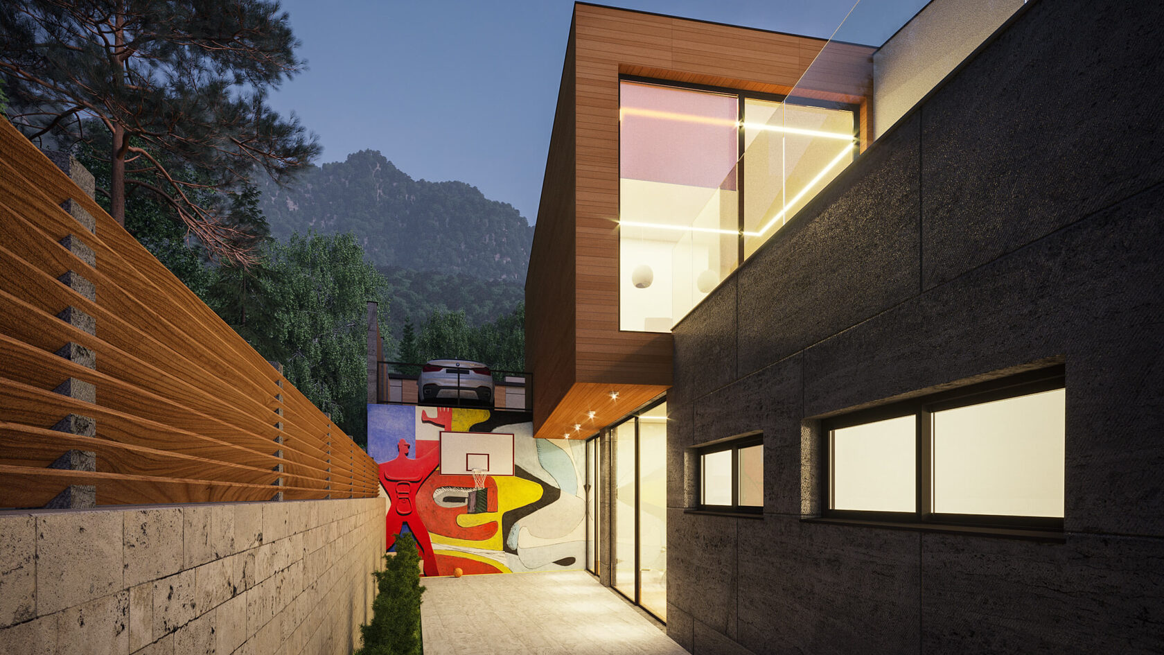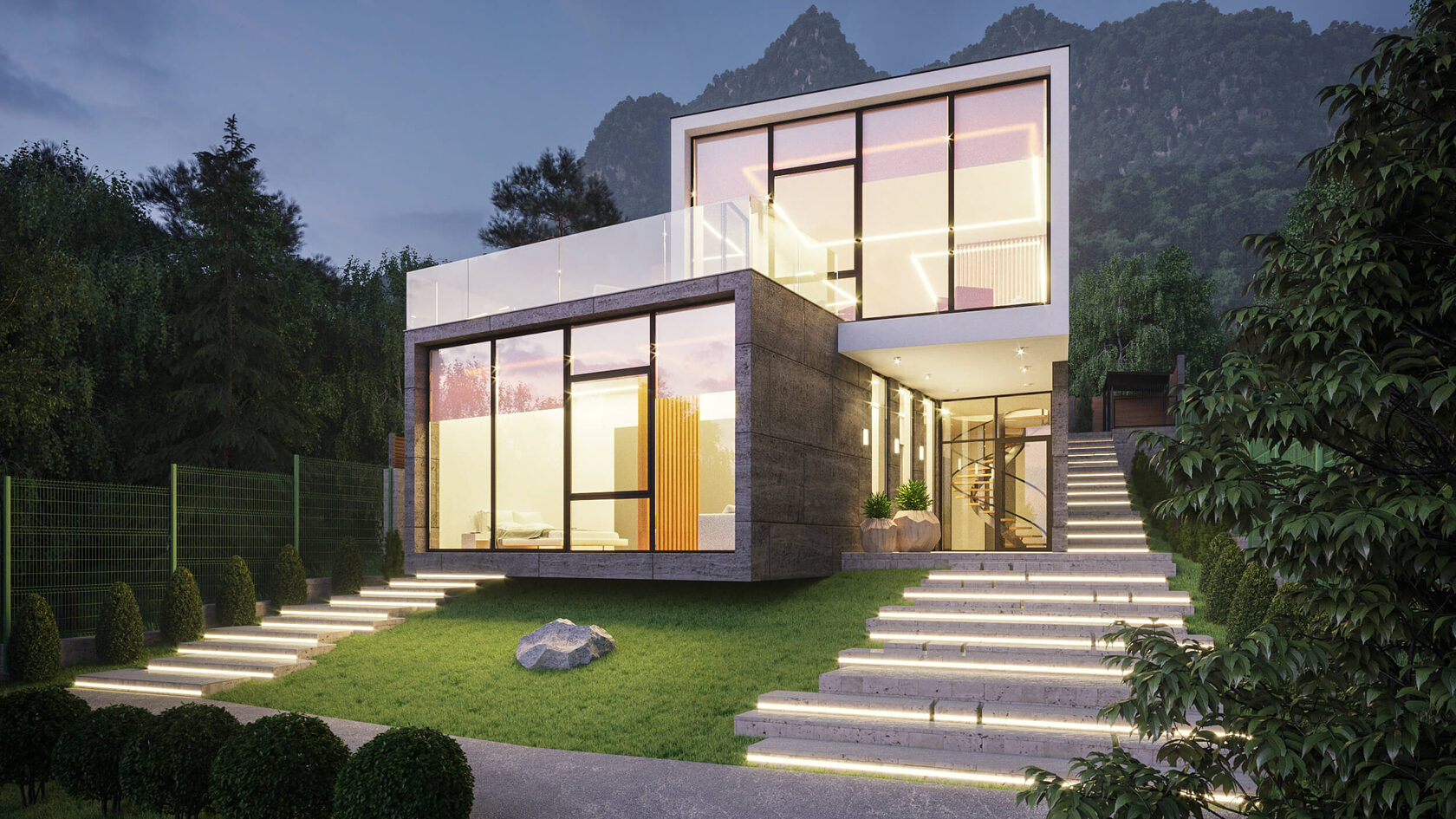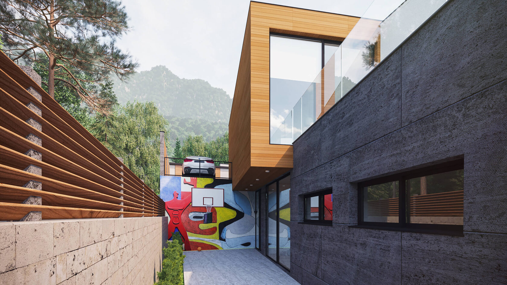 Компактная композиция лаконичных форм со стороны въезда раскрываются панорамными витражами в сторону благоустроенного двора и красивую долину с горными пейзажами.