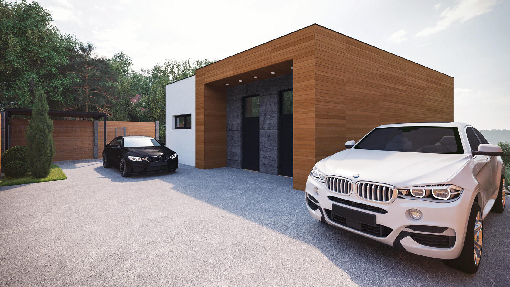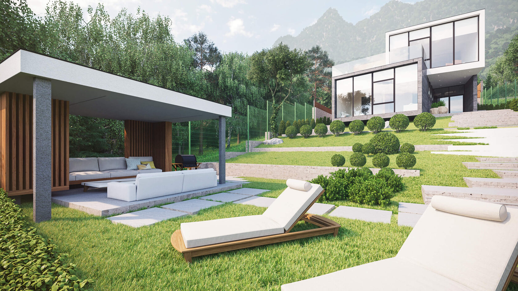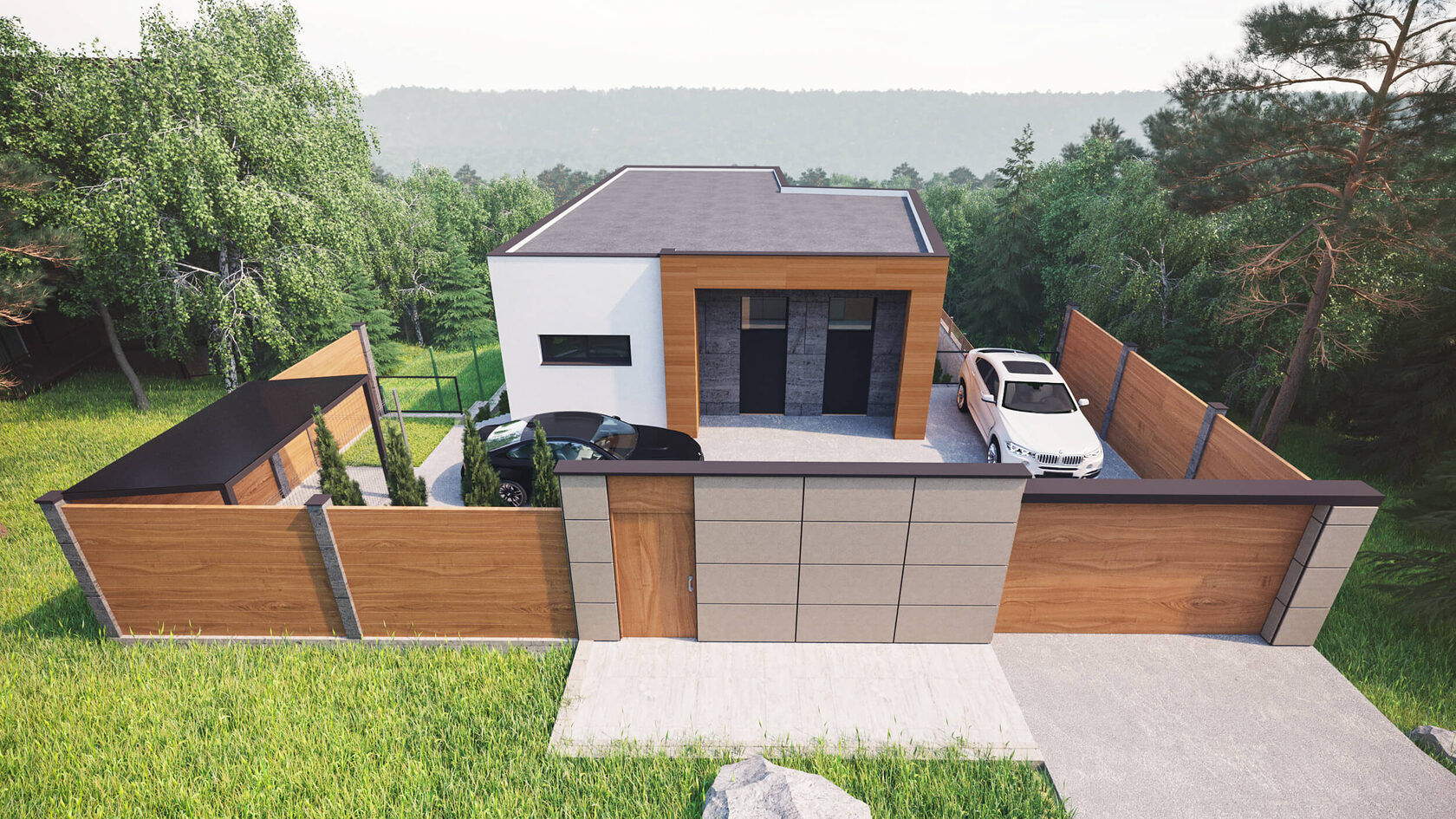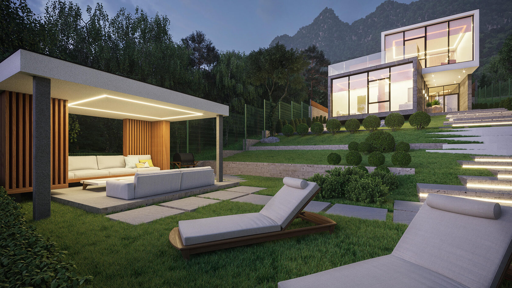 Компактная композиция лаконичных форм со стороны въезда раскрываются панорамными витражами в сторону благоустроенного двора и красивую долину с горными пейзажами.