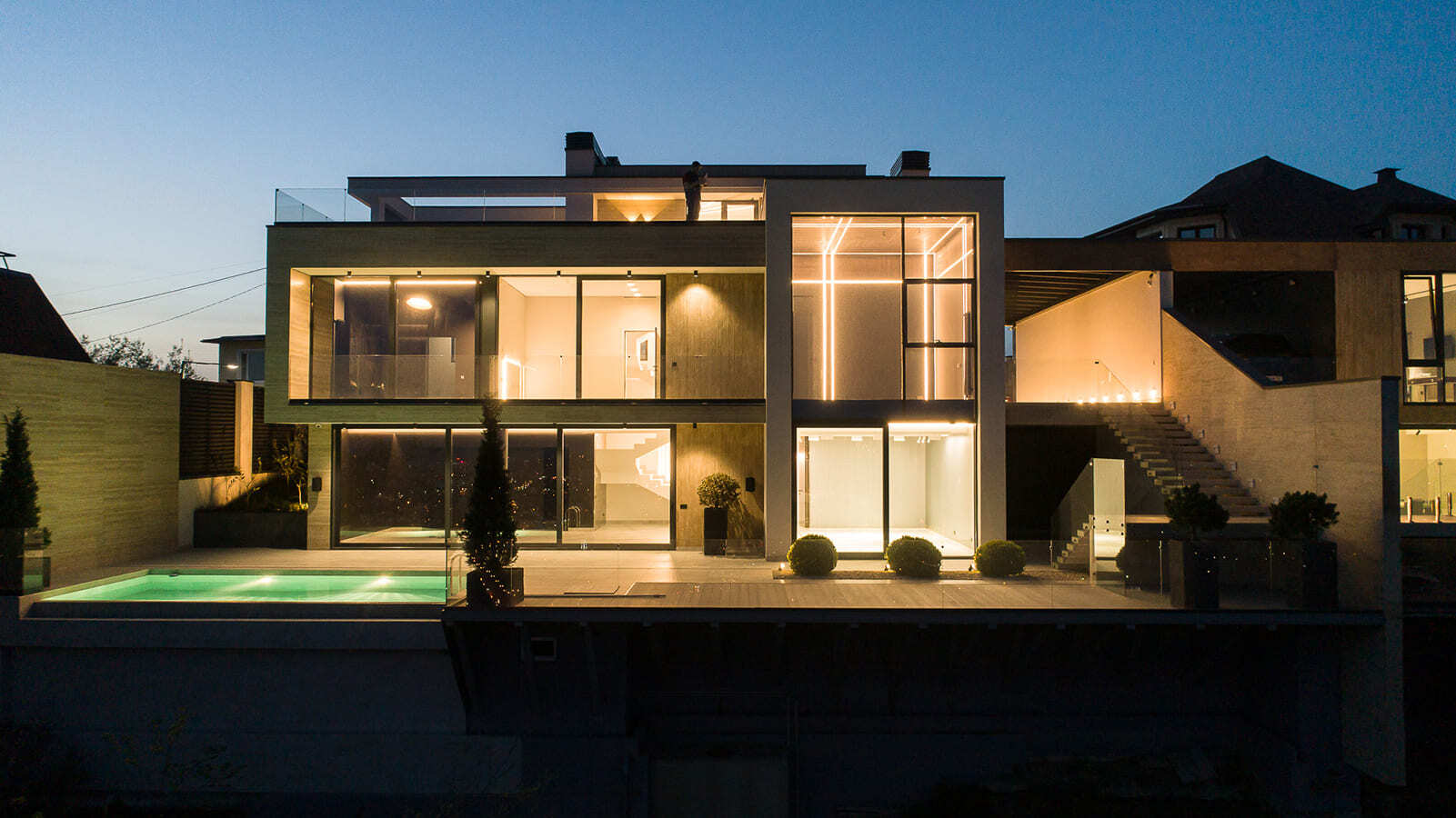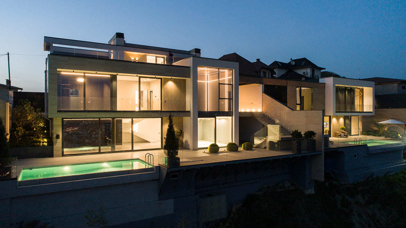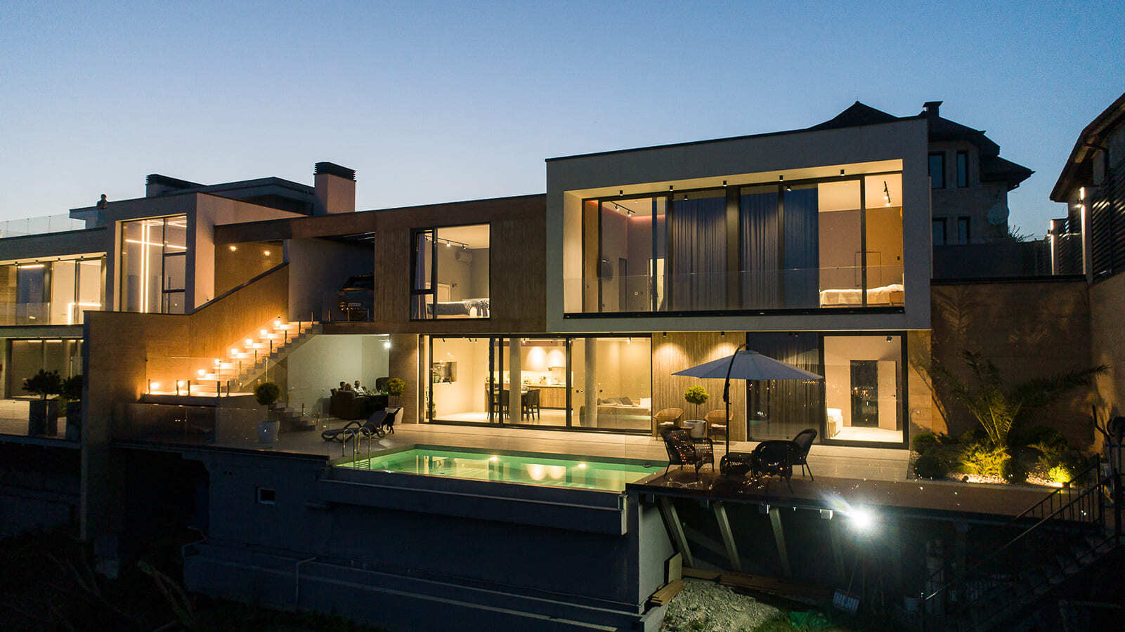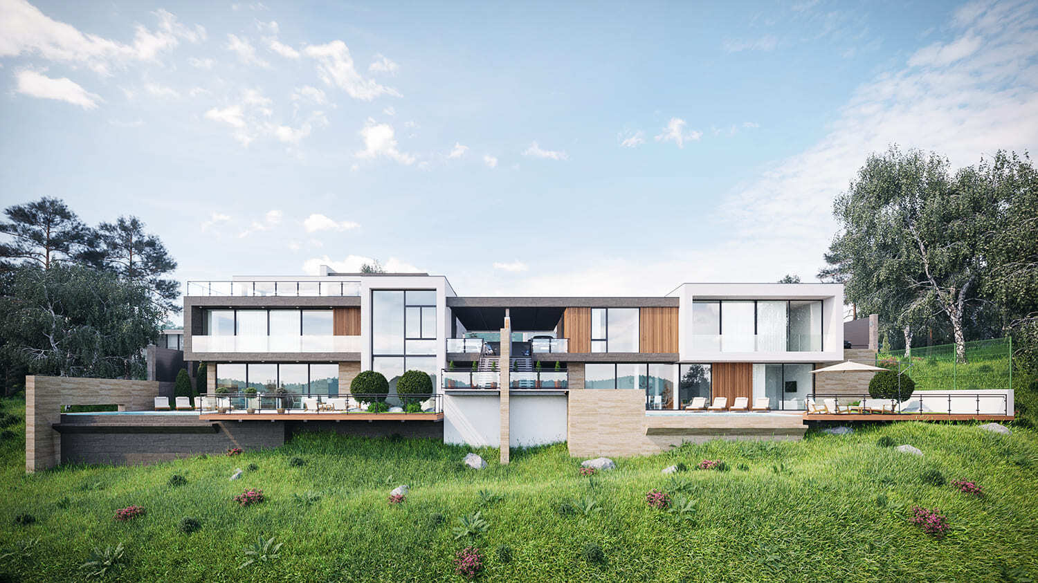 Наши объемно планировочные решения были направлены на использование этих исходных данных во благо будущих хозяев. Правильные инженерные решения помогли укрепить склон и расположить на самом краю обрыва 2 бассейна с переливом.