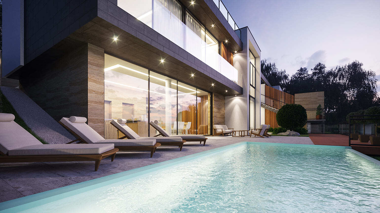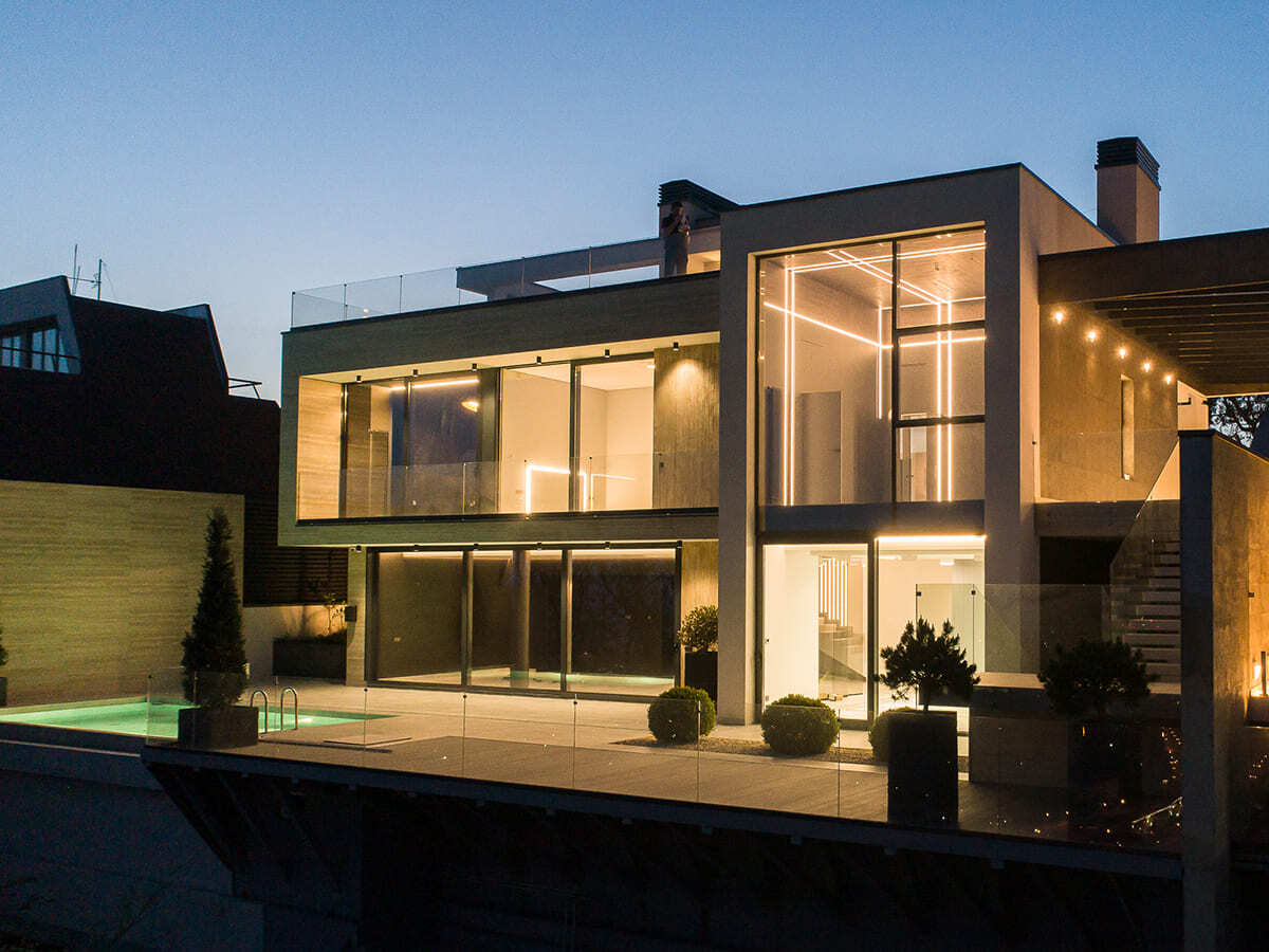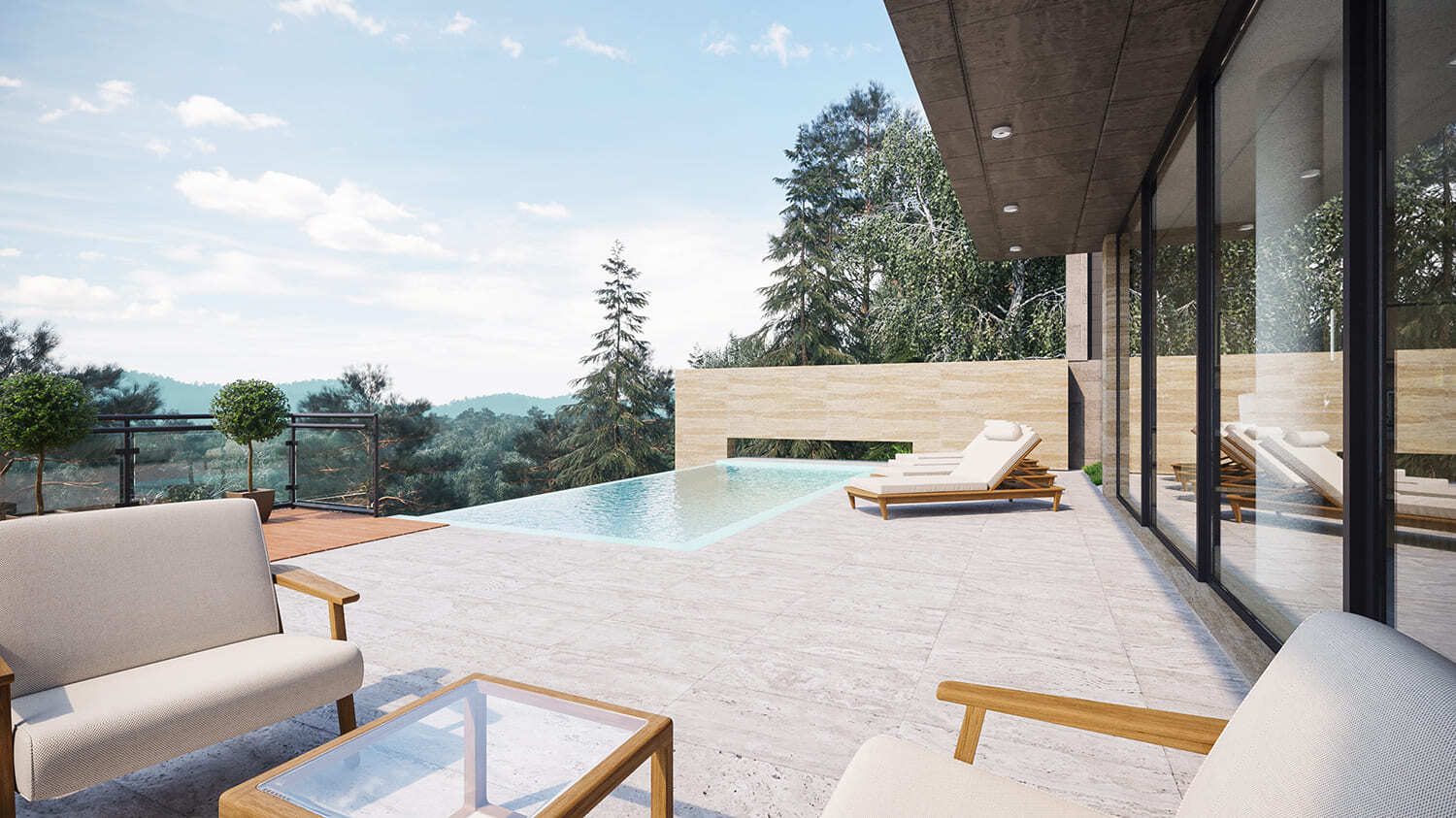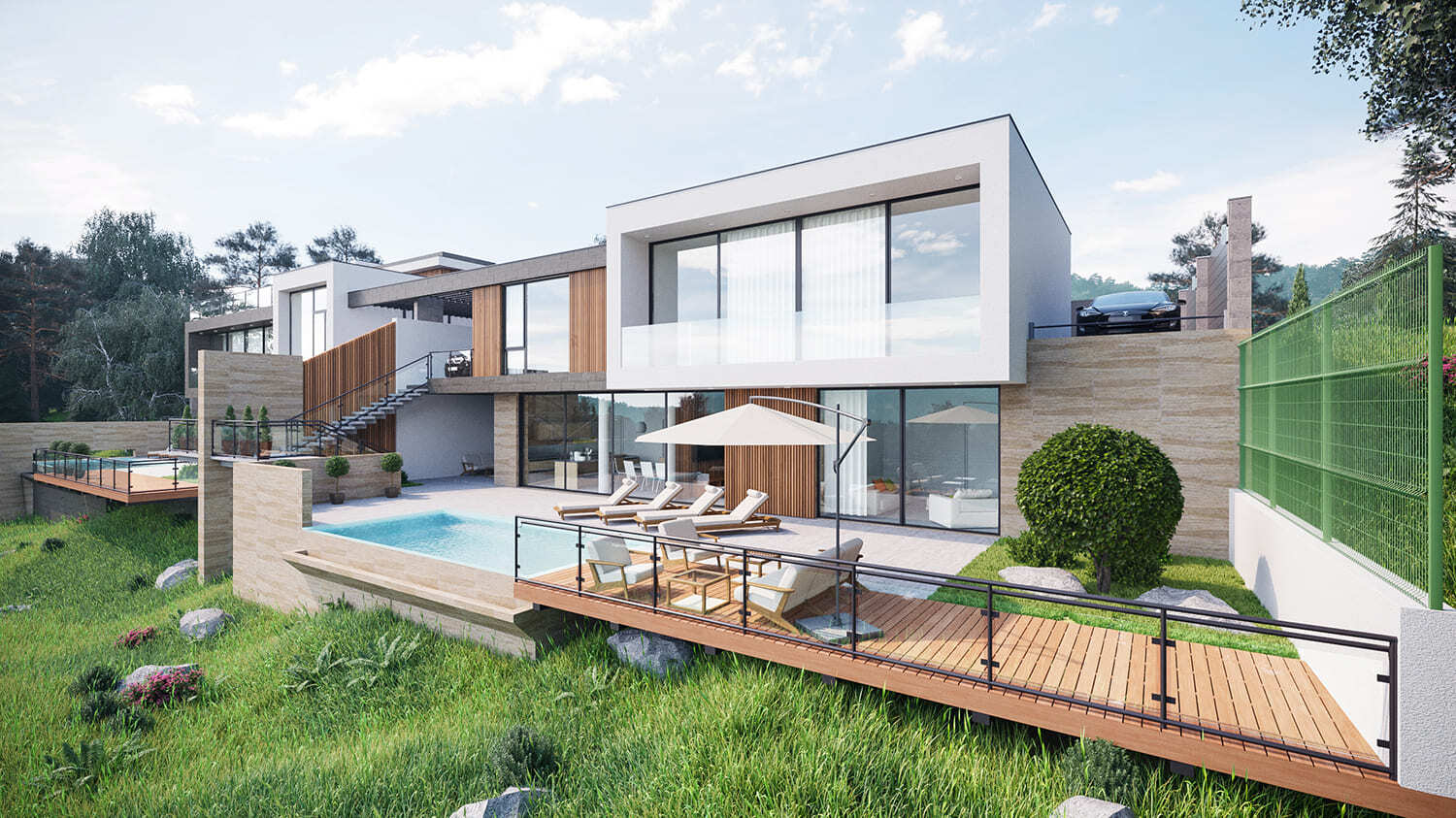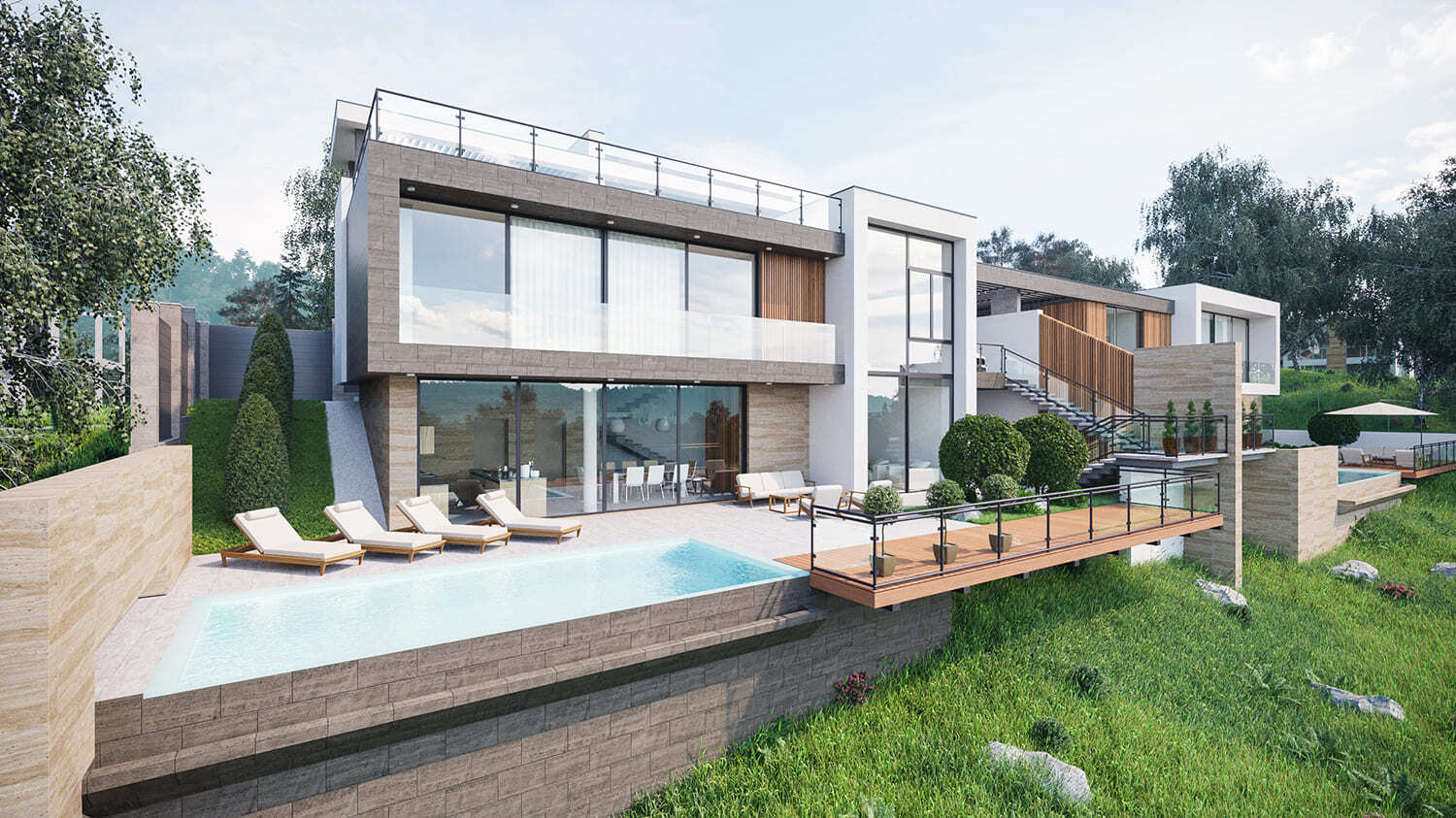Наши объемно планировочные решения были направлены на использование этих исходных данных во благо будущих хозяев. Правильные инженерные решения помогли укрепить склон и расположить на самом краю обрыва 2 бассейна с переливом.