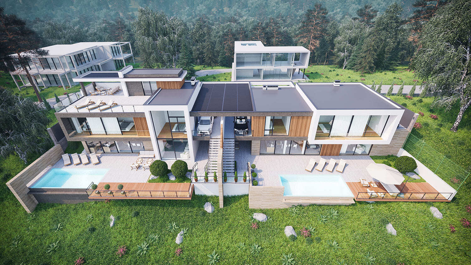 ▫️Во-первых по техзаданию Заказчика на площади в 6,5 соток необходимо было расположить 2 дома по 200 кв.м. с бассейнами, паркингом на 2−4 Машины каждому дому и небольшую клумбу.