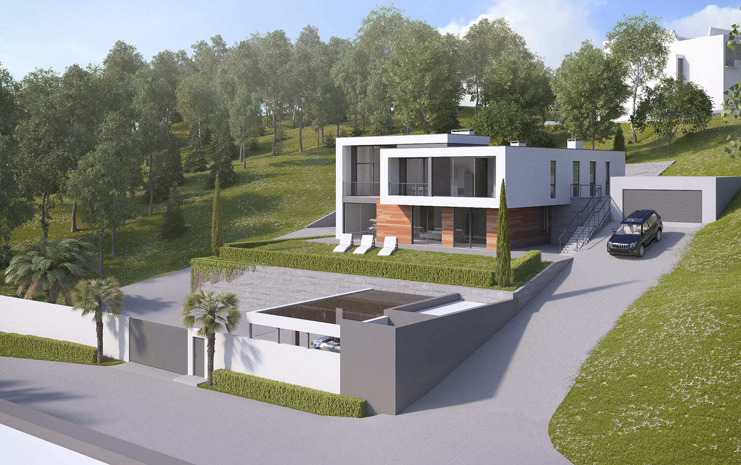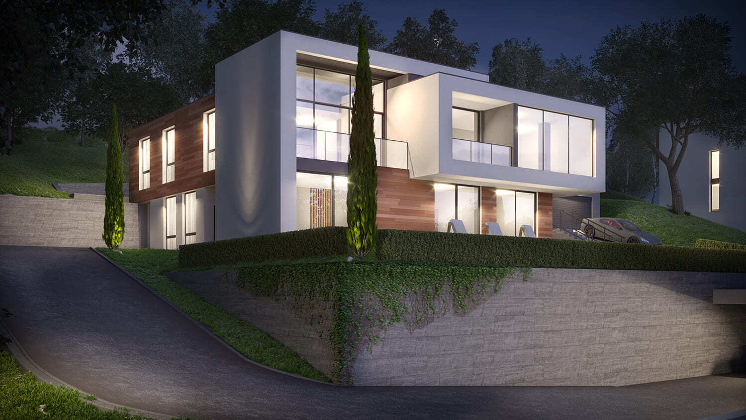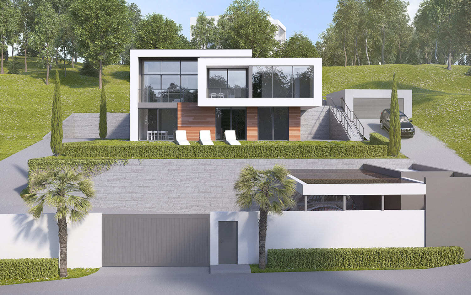 Лестница внутри дома связывает не только оба этажа, но и благоустроенные террасы верхнего и среднего ярусов участка. На нижнем уровне придомовой территории расположен въезд и крытая парковка для нескольких машин.