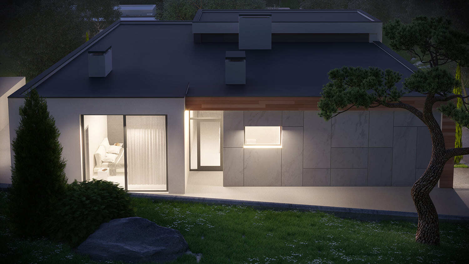 Дом построен по всем канонам стиля минимализм. Фасад представлен лаконичной композицией геометрических форм где мы скомбинировали декоративную штукатурку и фиброцементные панели с фактурой дерева.