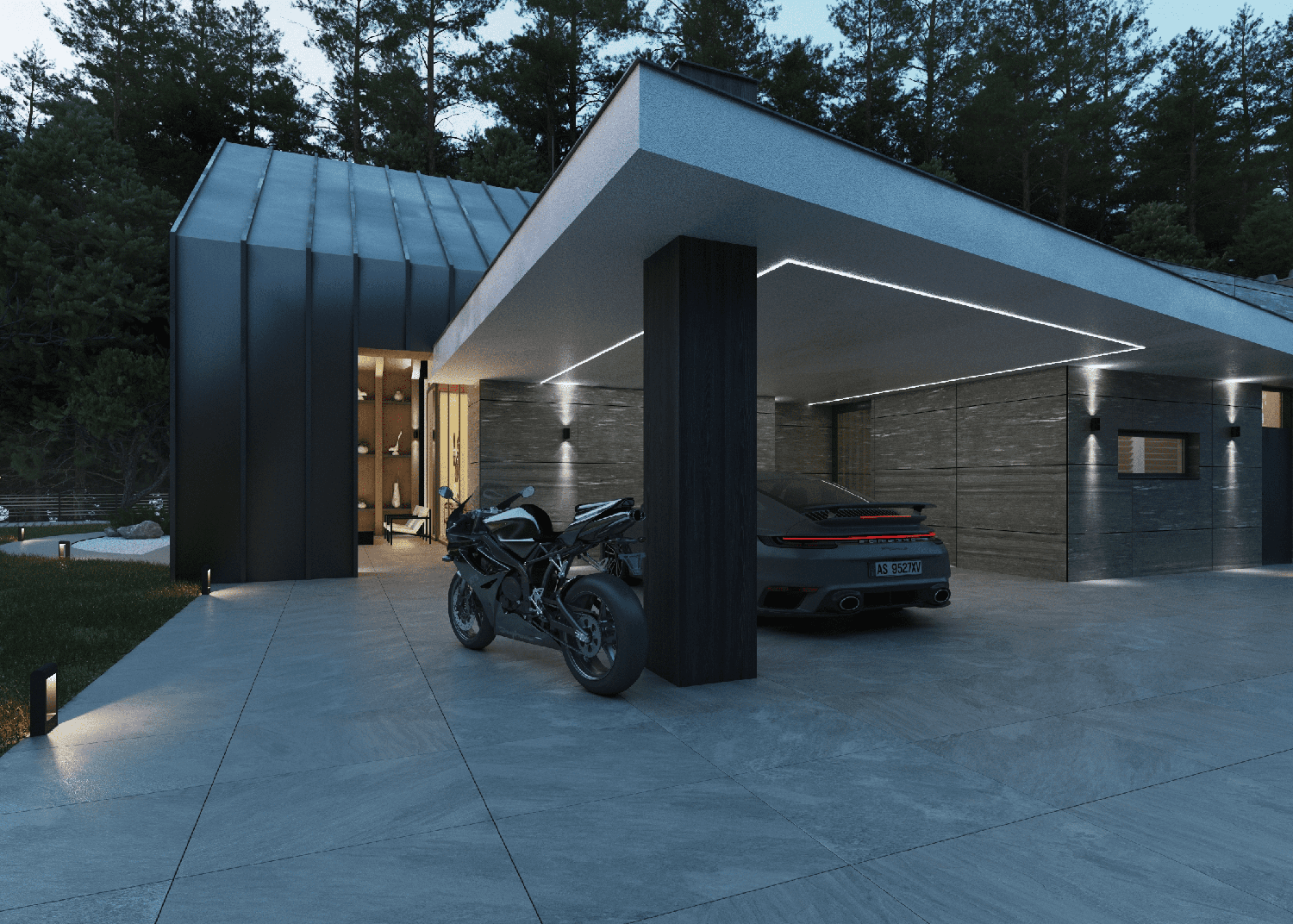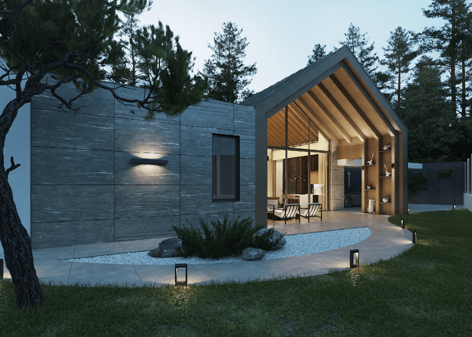Мы применили на фасадных материалах сочетание 3 текстур: фиброцементный фасад под дерево, керамогранит большого формата с имитацией природного камня и белую минеральную крошку.