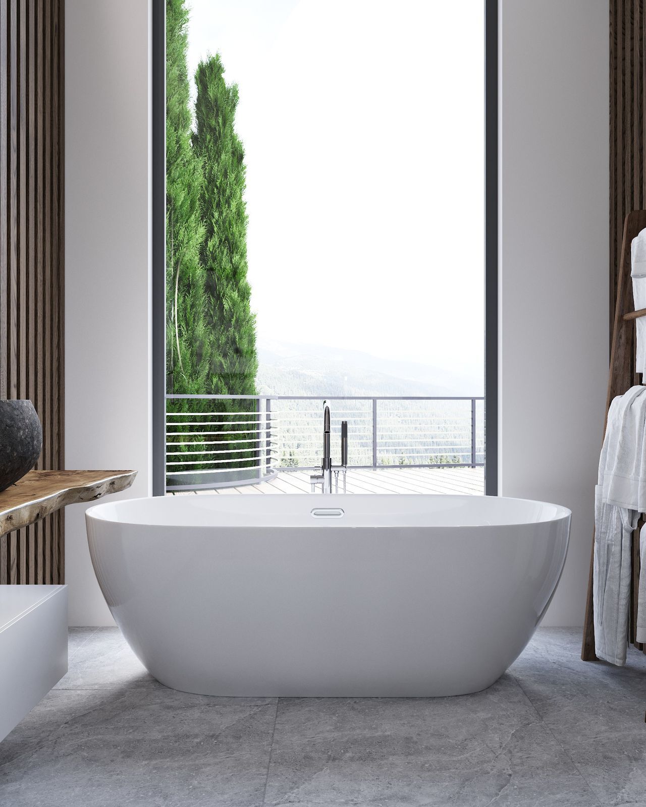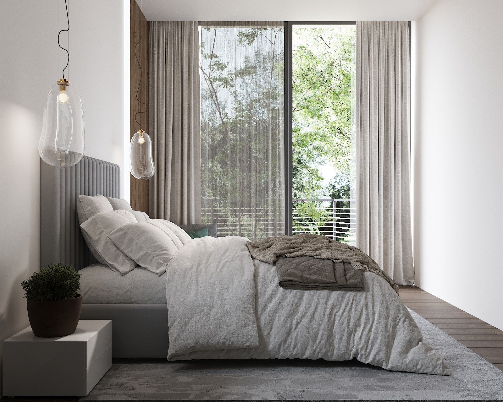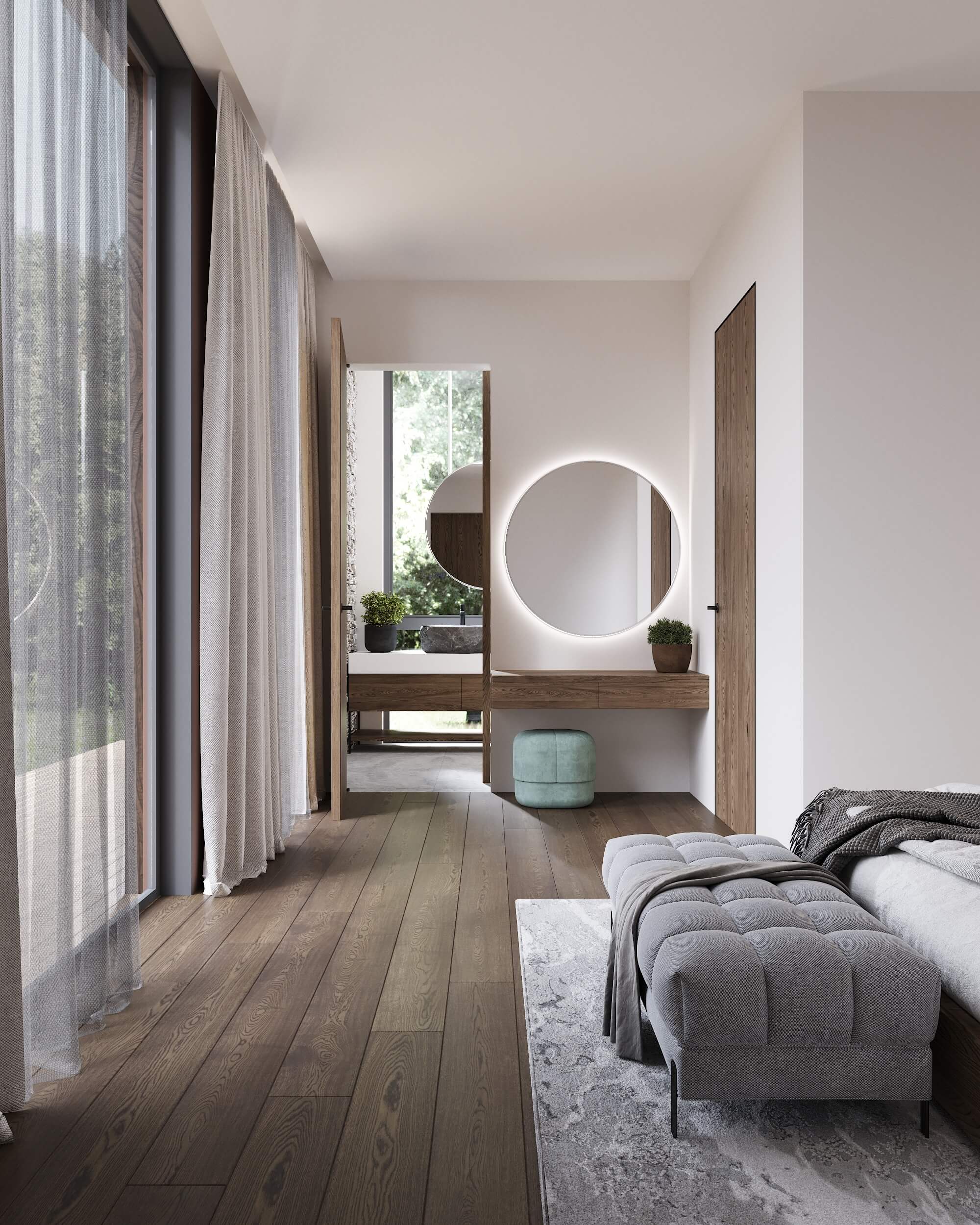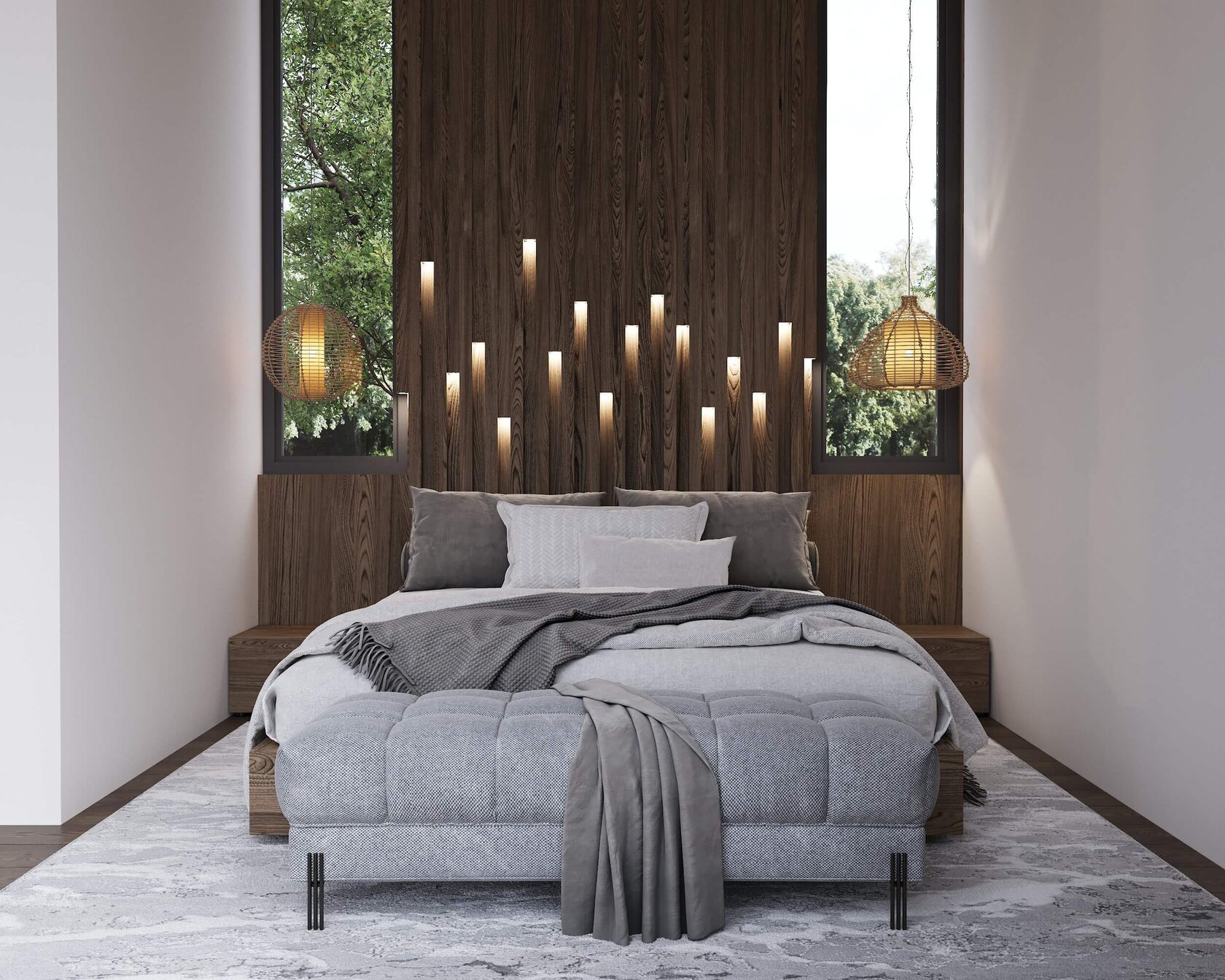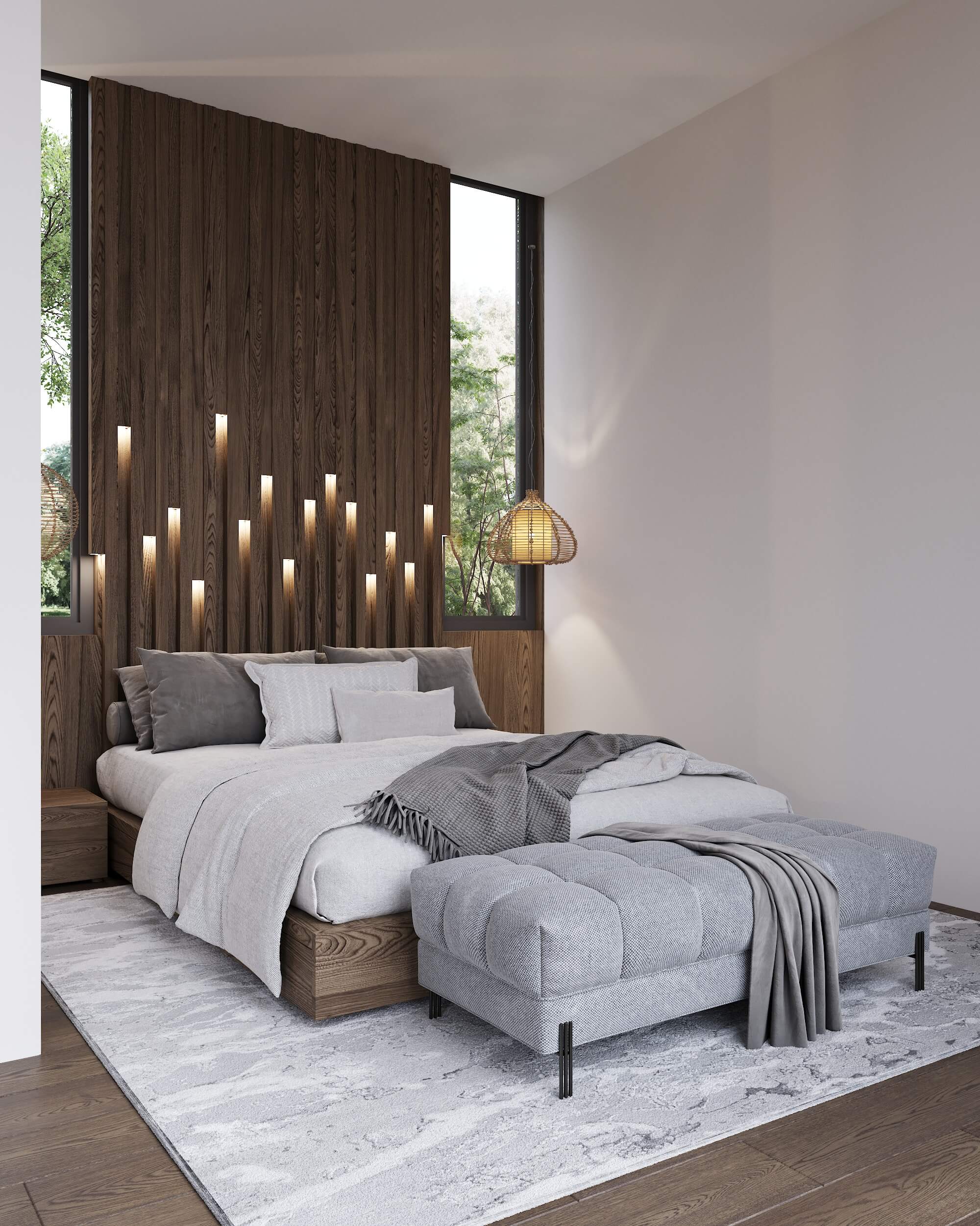 Панорамные окна охватывают все жилые спальни и ряд санузлов, вид открывается на зеленый лесной массив национального парка.
