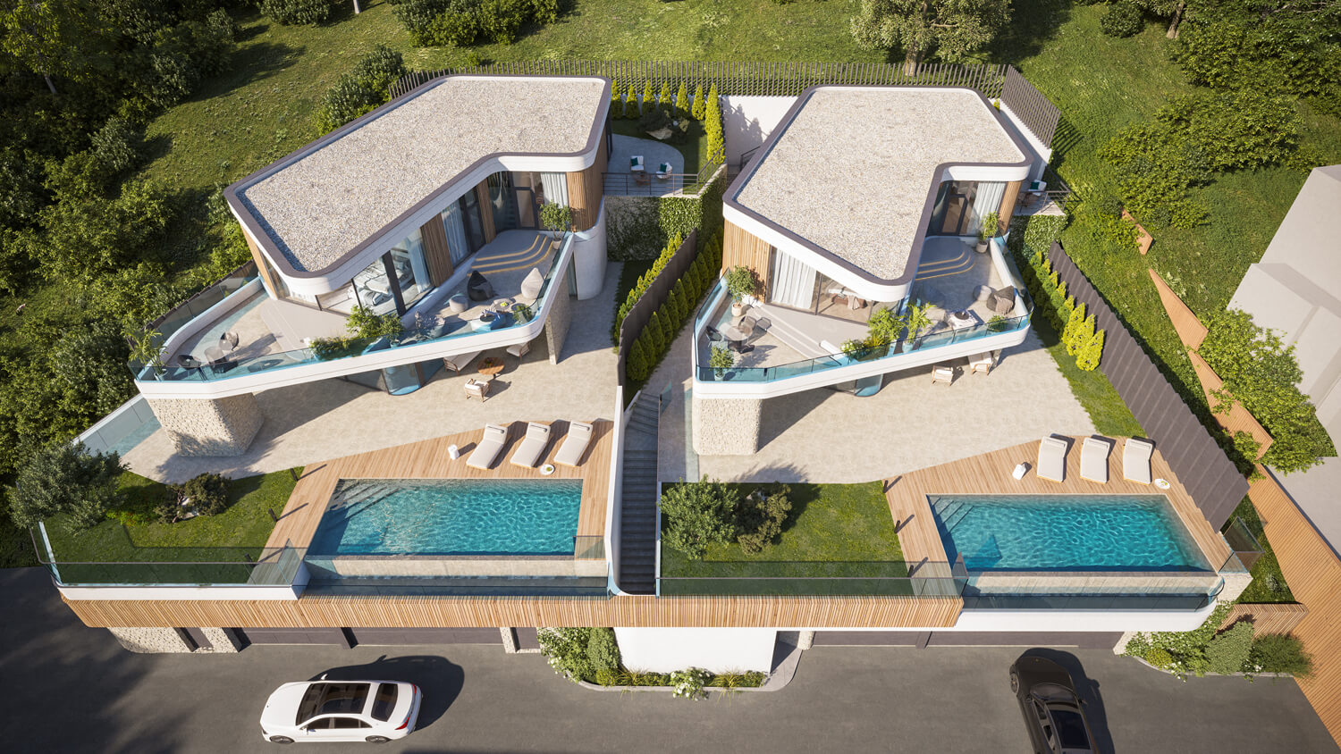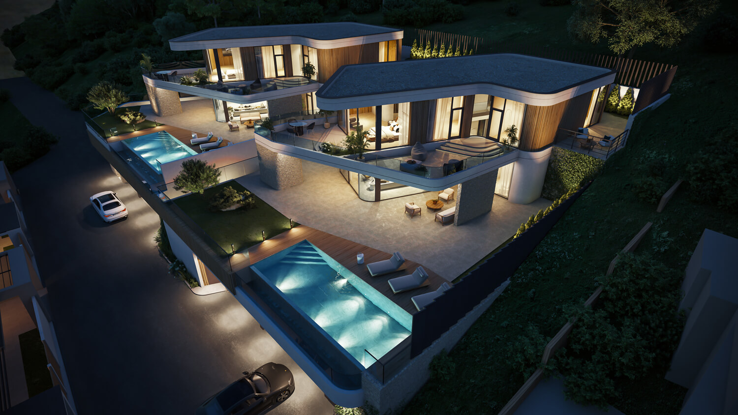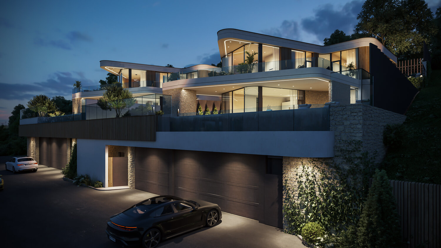 Чтобы сохранить эффект открытого пространства и подчеркнуть панорамы, мы приподняли первый этаж вилл на 6 метров, создав высокий стилобат с парковкой, бассейном, техническими помещениями и лифтом, соединяющим уровень въезда с жилой зоной.