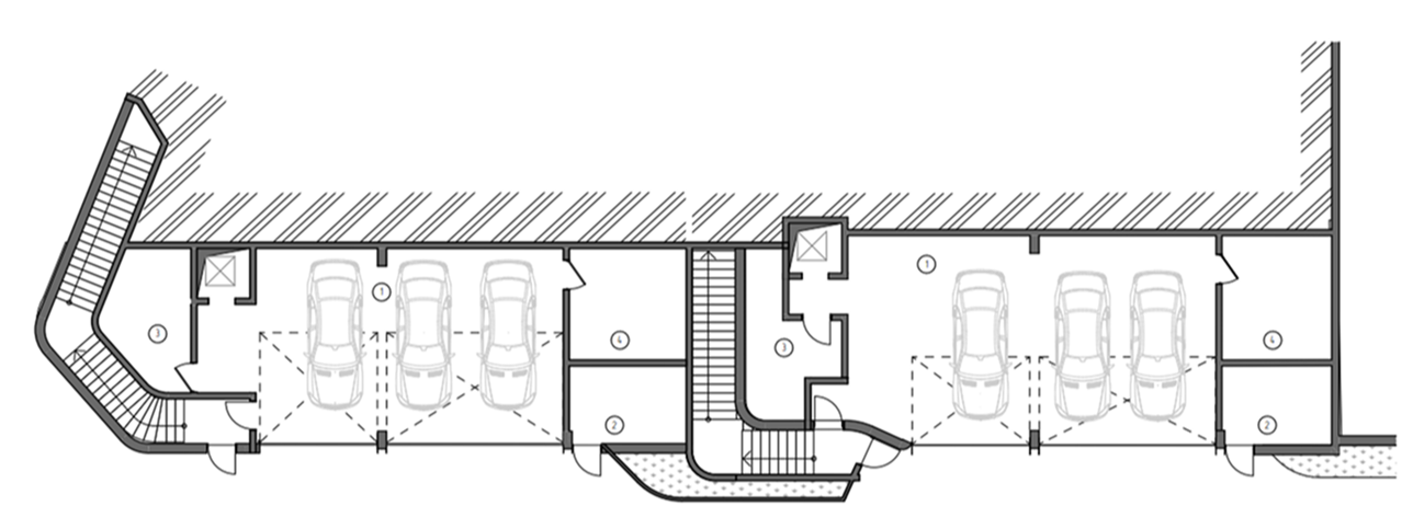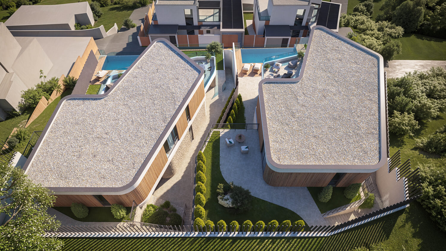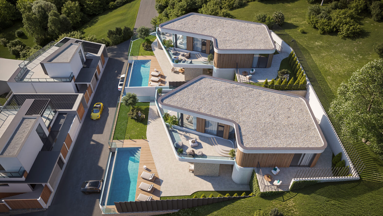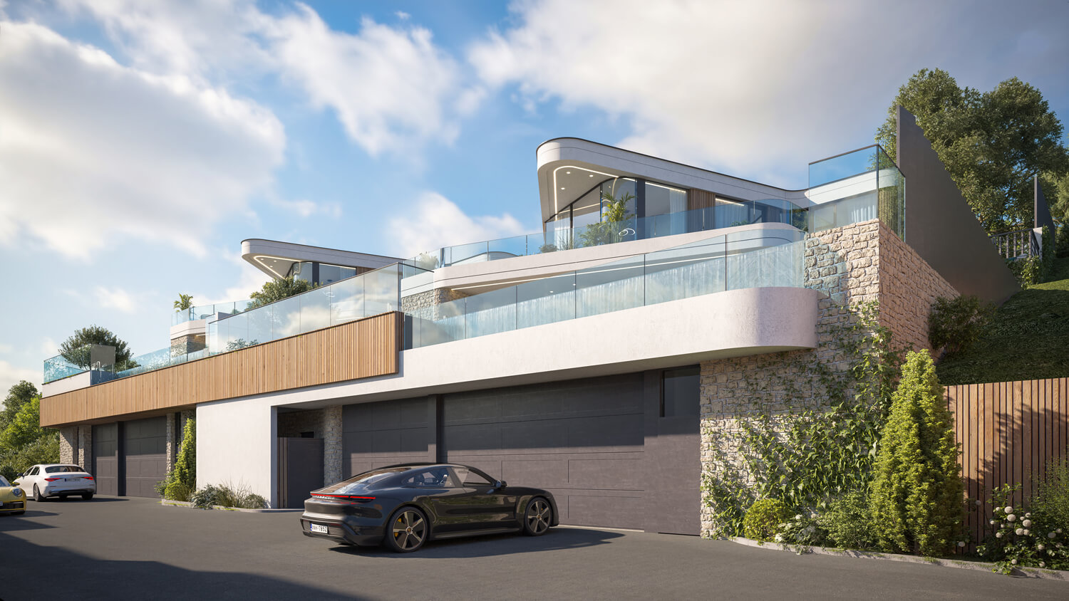 Чтобы сохранить эффект открытого пространства и подчеркнуть панорамы, мы приподняли первый этаж вилл на 6 метров, создав высокий стилобат с парковкой, бассейном, техническими помещениями и лифтом, соединяющим уровень въезда с жилой зоной.