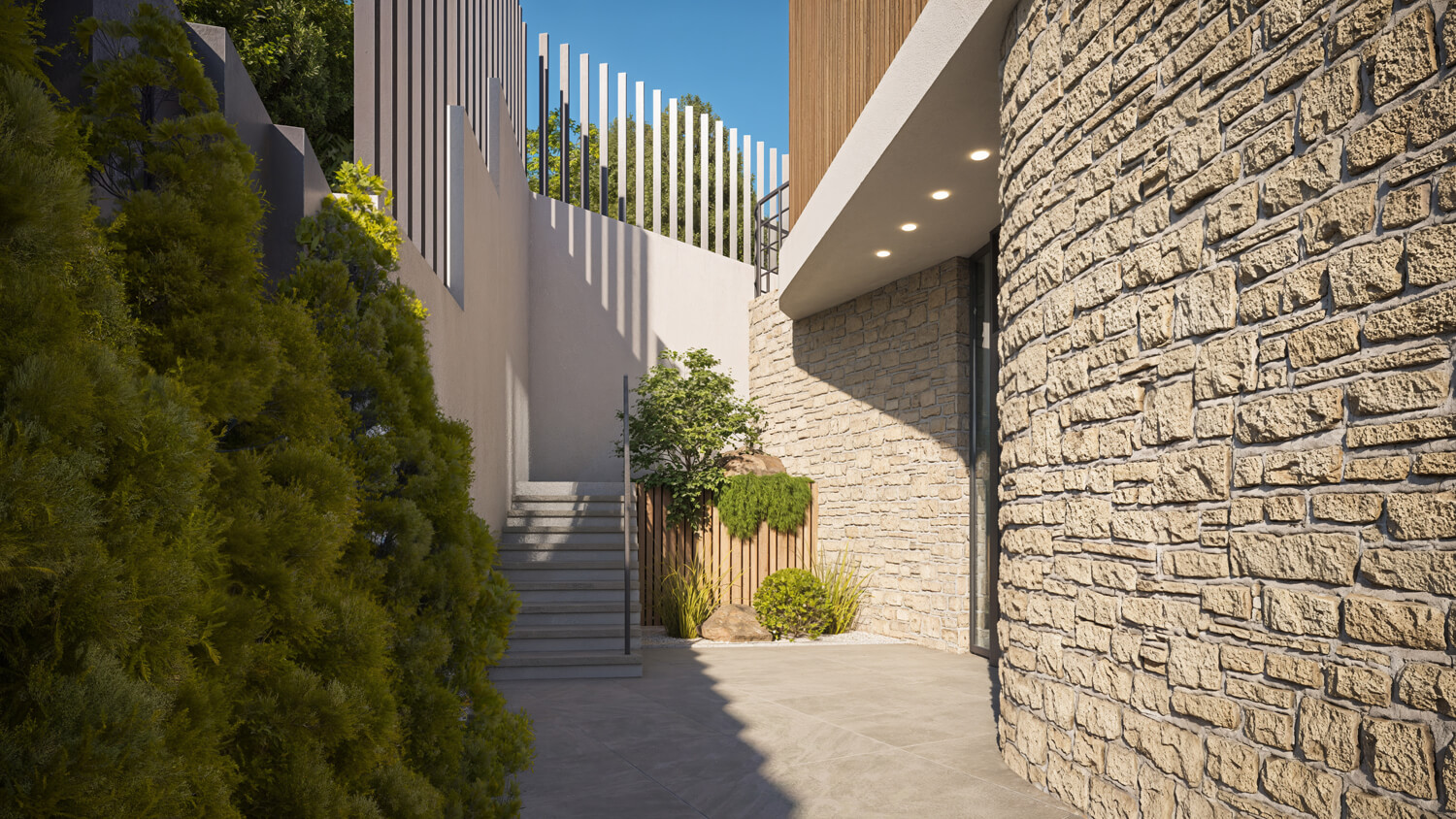 - Природные материалы — кварцит и реечные панели из ДПК, устойчивые к влажному климату Сочи