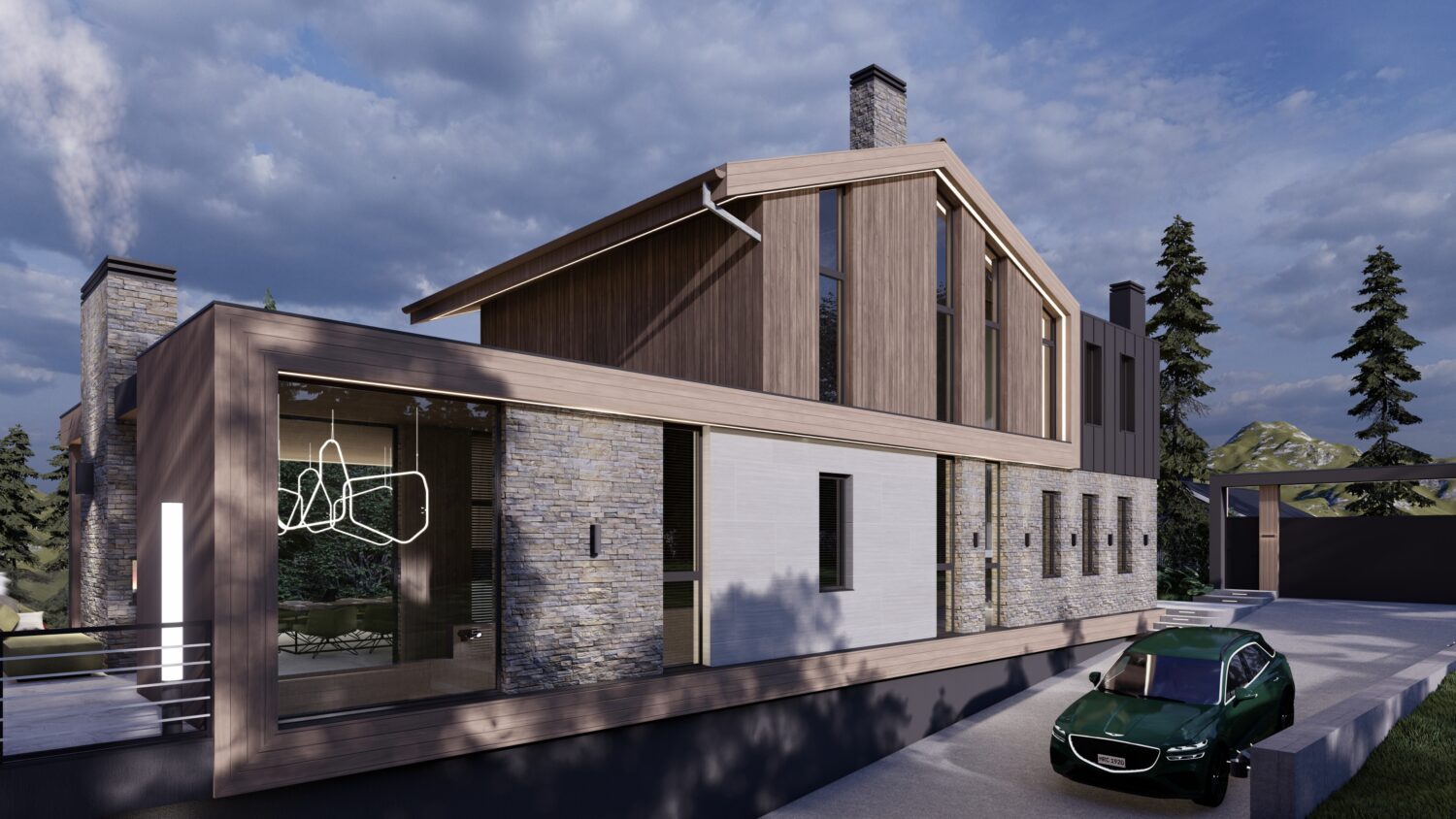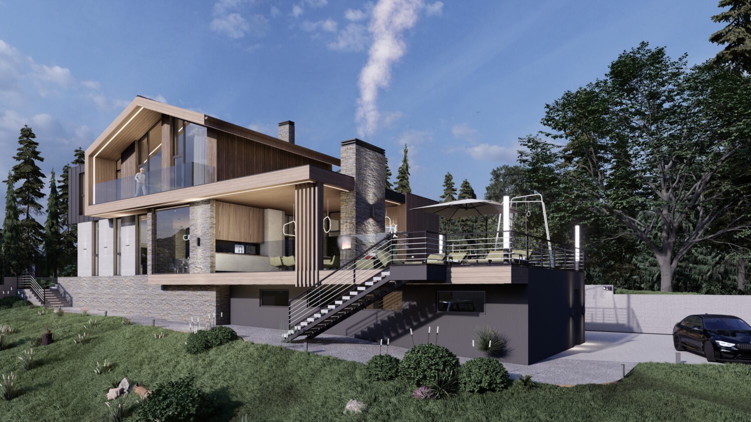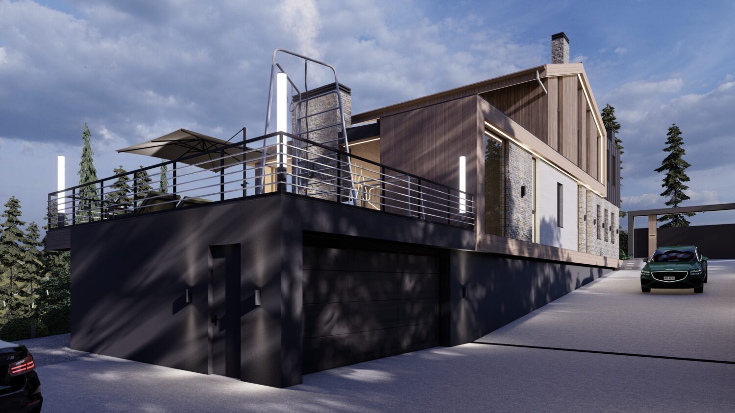Наш заказчик страстный автолюбитель и у нас в доме предусмотрен большой паркинг, эксплуатируемая кровля которого образовывает живописную зону патио, смежную с кухней-гостиной.