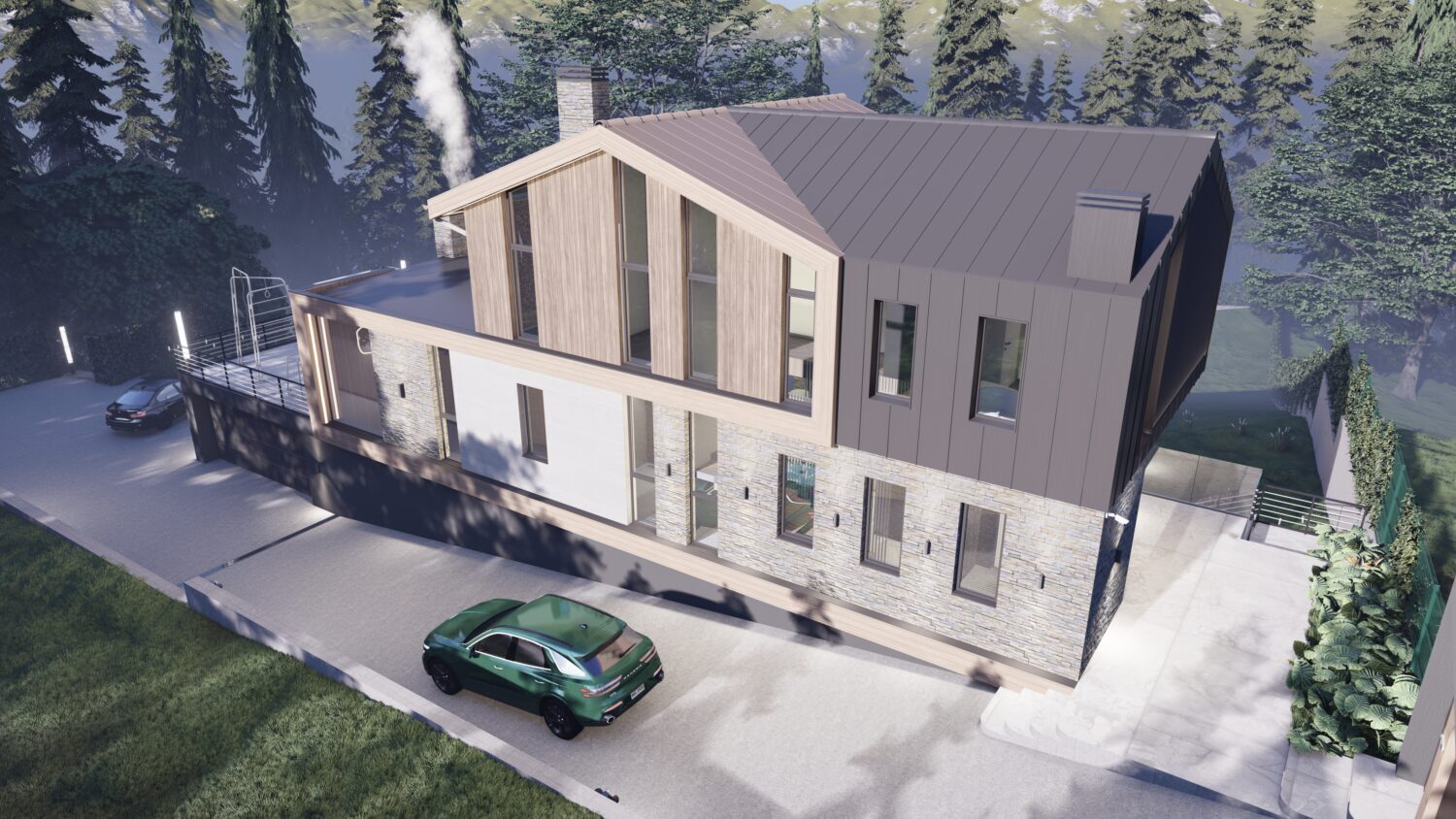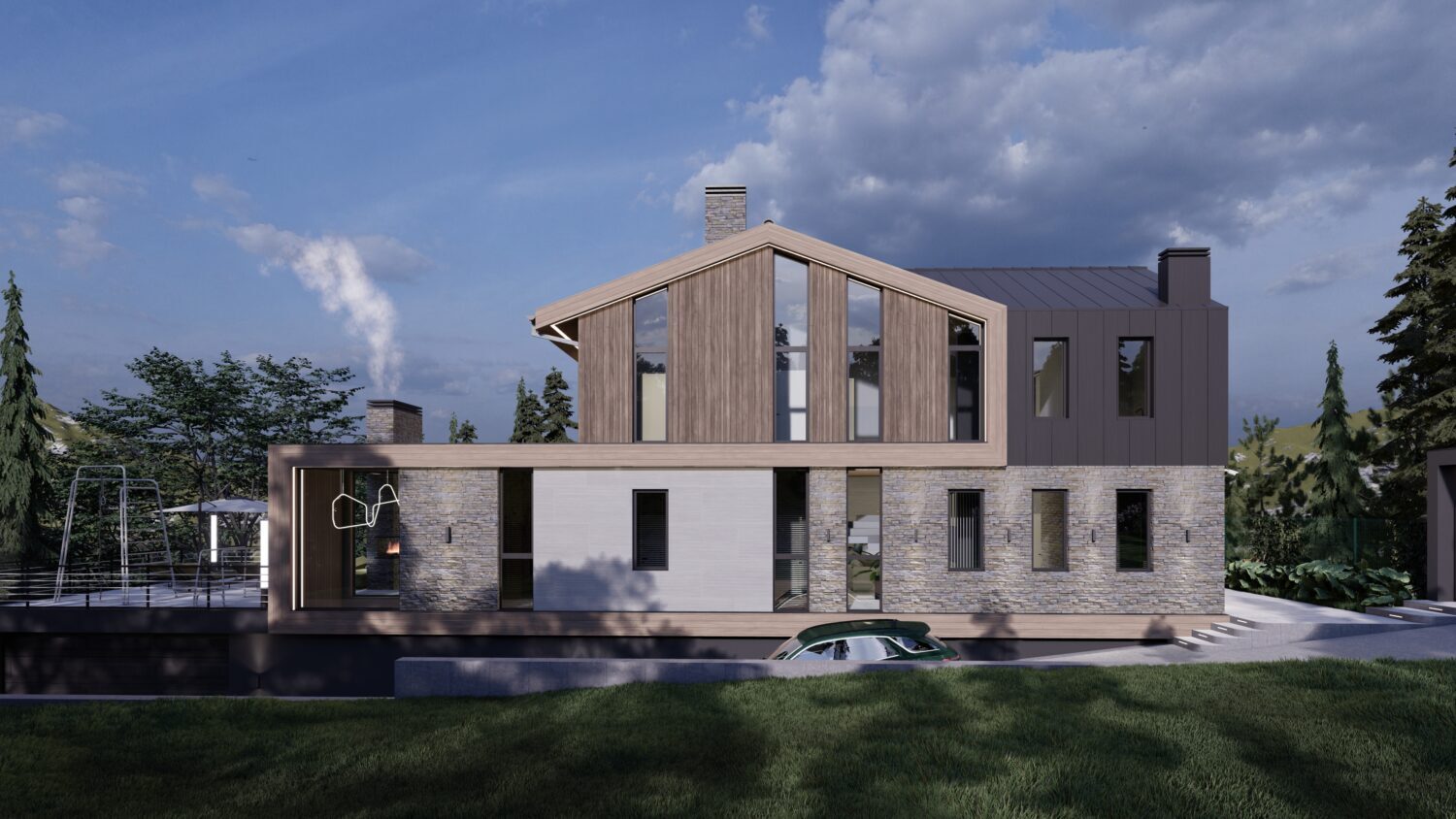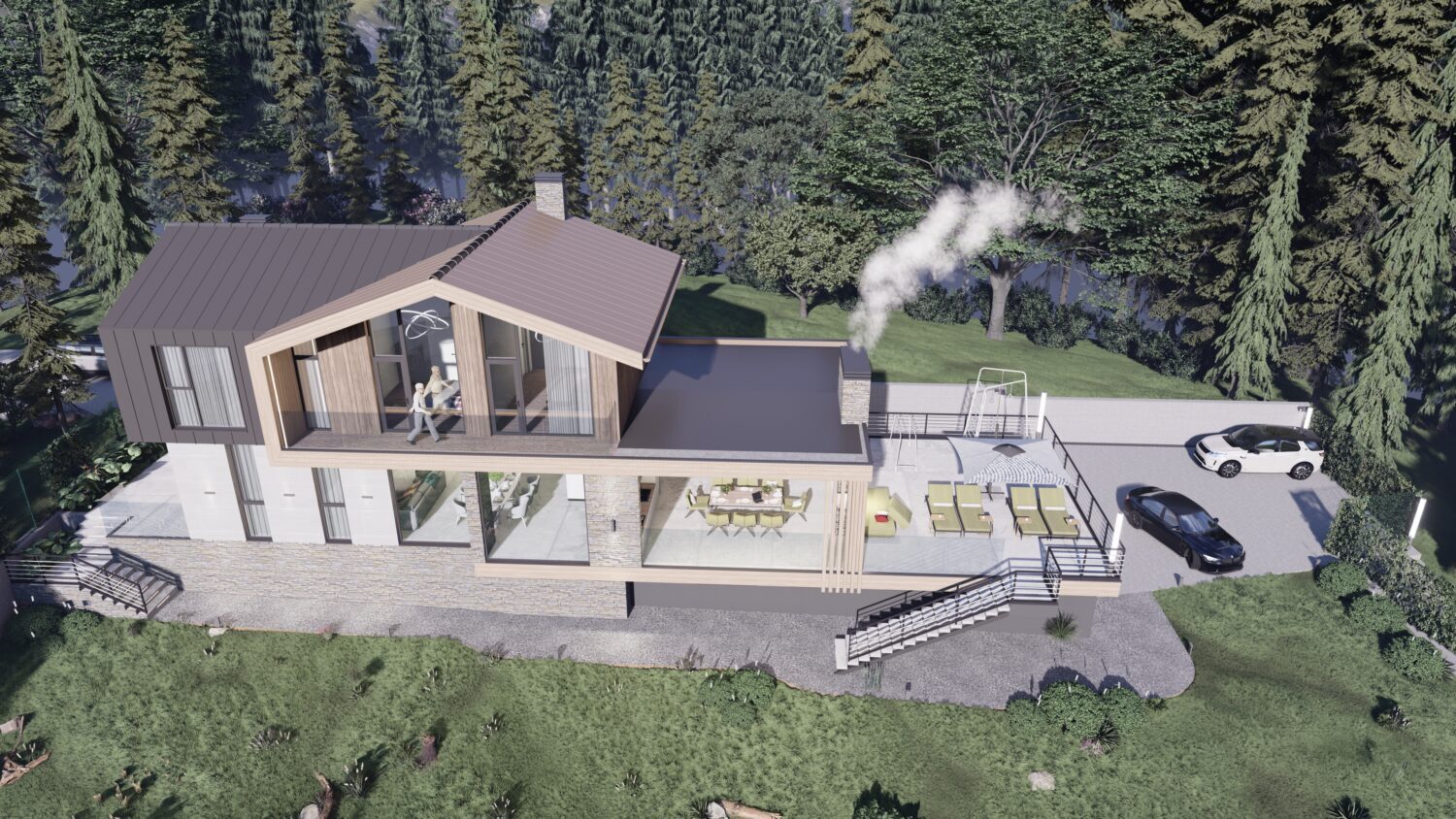 Наш заказчик страстный автолюбитель и у нас в доме предусмотрен большой паркинг, эксплуатируемая кровля которого образовывает живописную зону патио, смежную с кухней-гостиной.